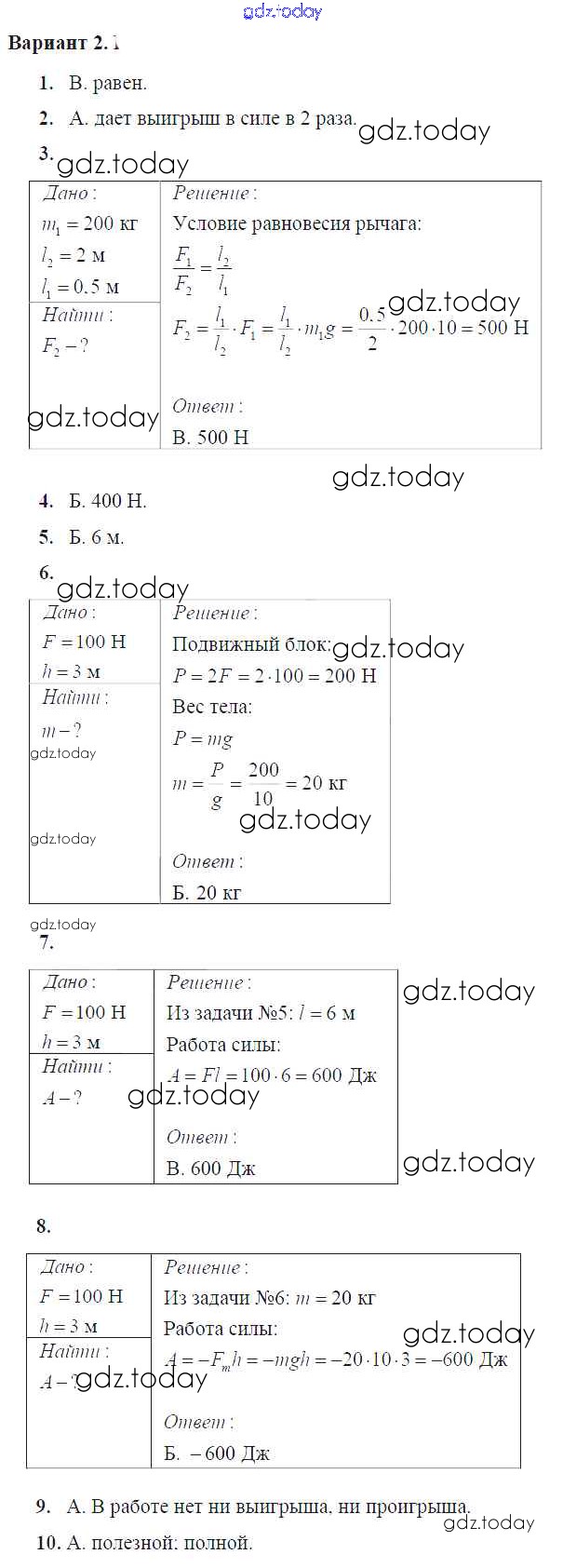 Ответы к Тест №10. Простые механизмы. КПД простых механизмов Решение к тестам для самоконтроля Вариант №2 Дидактическим материалам по Физике для 7 класса Марон Дрофа Вертикаль 2019