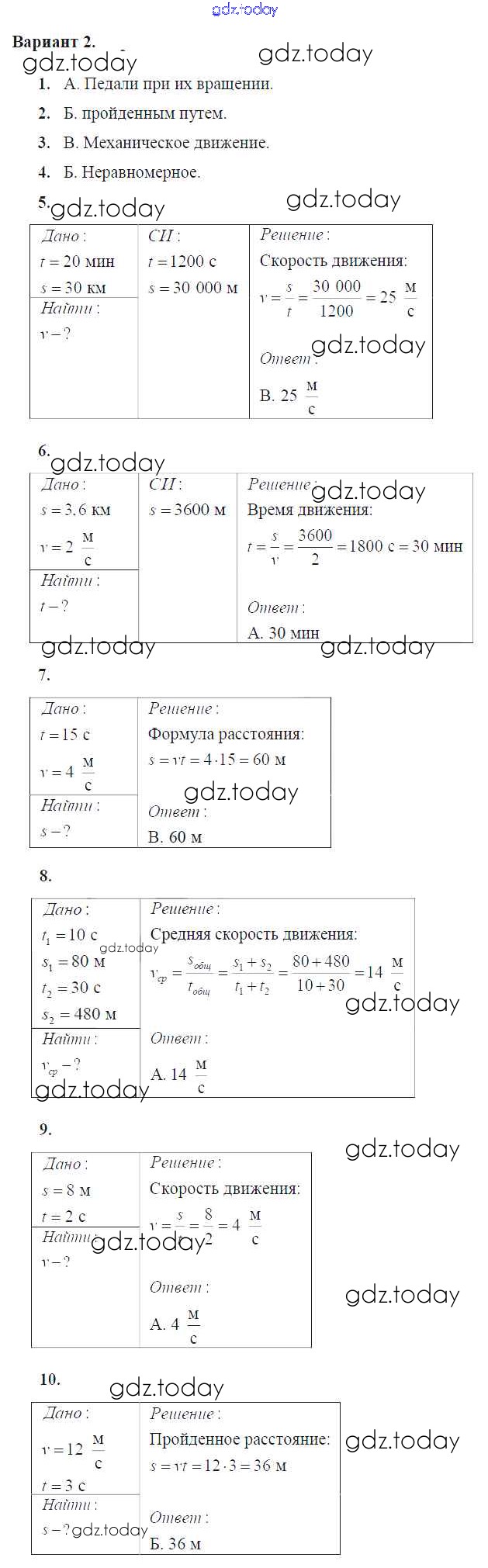 На страницах сайта gdz.today вы найдете учебный и вспомогательный материал, направленный на улучшения знаний школьной программы. ГДЗ - онлайн мир знаний Тест №2. Механическое движение Решение к тестам для самоконтроля Вариант №2 Дидактическим материалам по Физике для 7 класса Марон Дрофа Вертикаль 2019