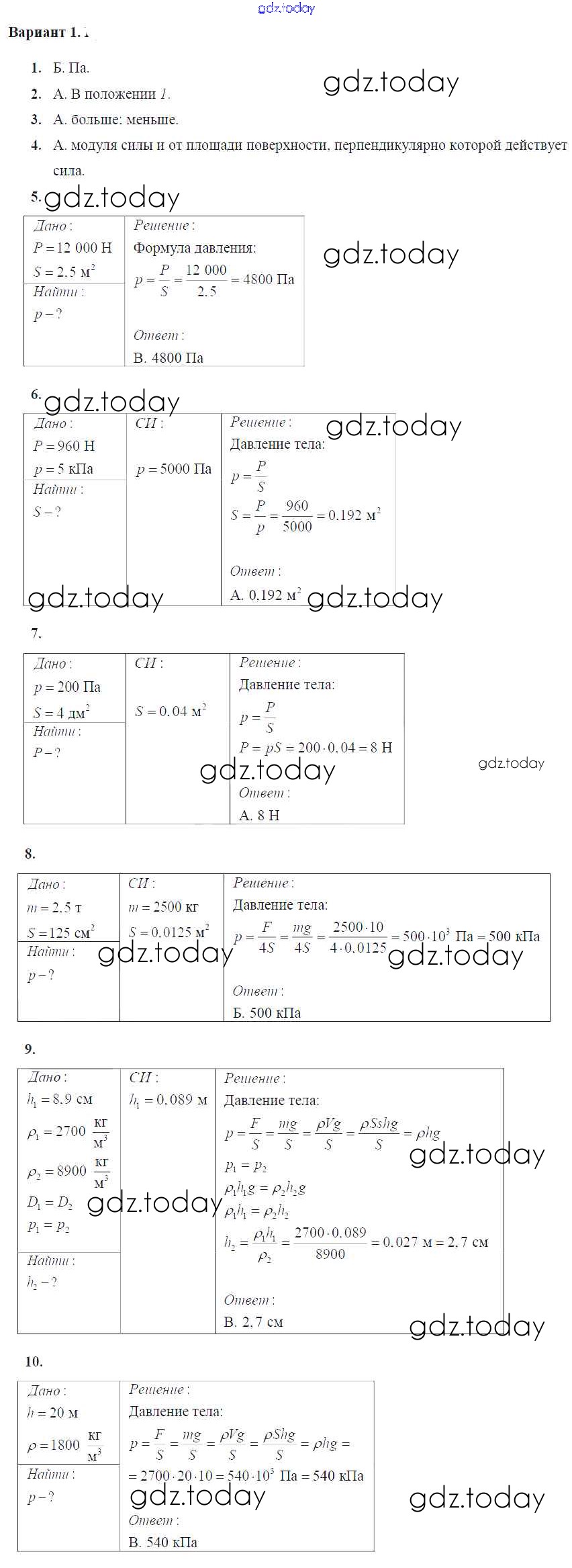 На страницах сайта gdz.today вы найдете учебный и вспомогательный материал, направленный на улучшения знаний школьной программы. ГДЗ - онлайн мир знаний Тест №5. Давление твердых тел Решение к тестам для самоконтроля Вариант №1 Дидактическим материалам по Физике для 7 класса Марон Дрофа Вертикаль 2019