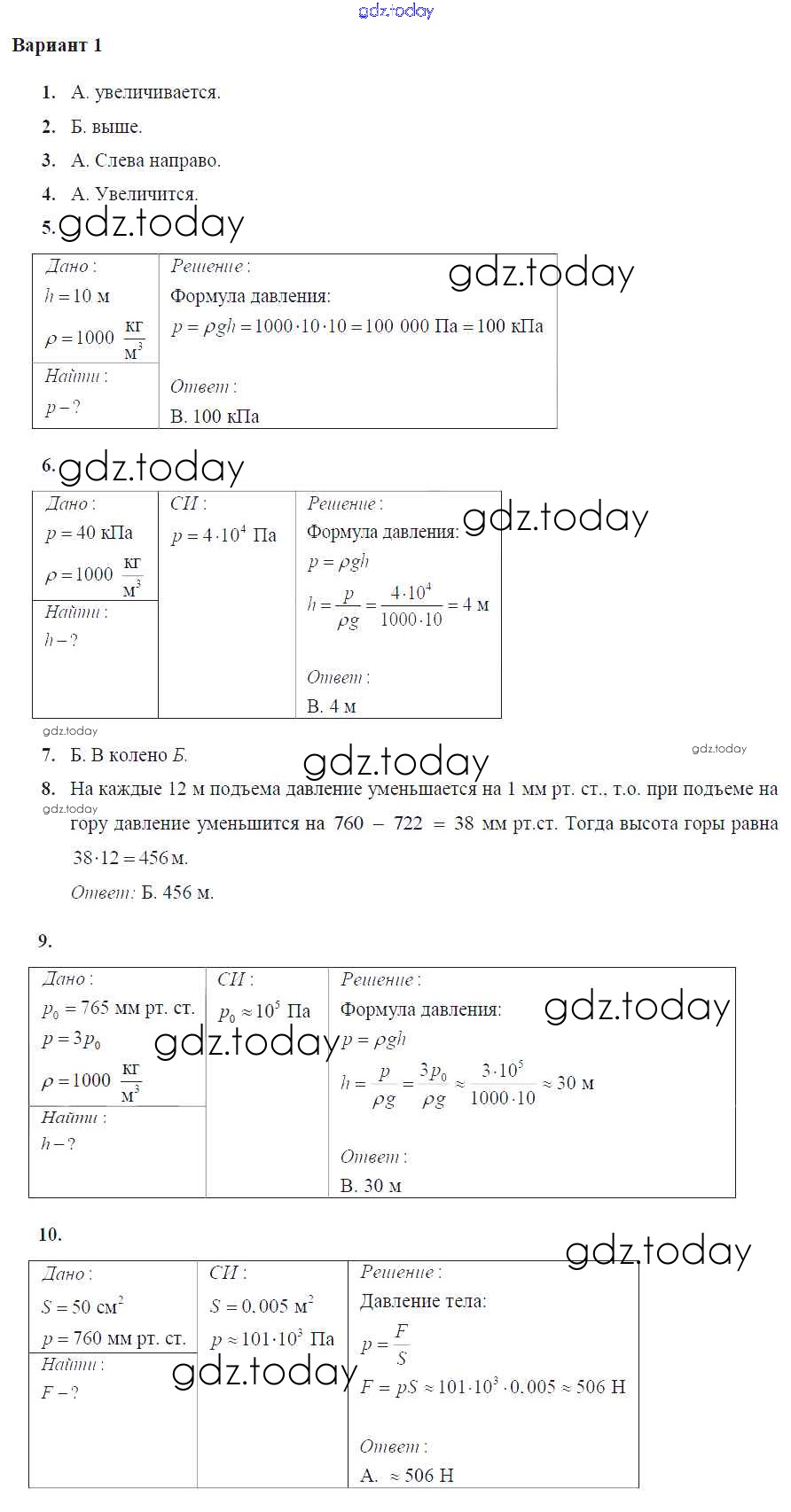 На страницах сайта gdz.today вы найдете учебный и вспомогательный материал, направленный на улучшения знаний школьной программы. ГДЗ - онлайн мир знаний Тест №6. Давление в жидкостях и газах Решение к тестам для самоконтроля Вариант №1 Дидактическим материалам по Физике для 7 класса Марон Дрофа Вертикаль 2019