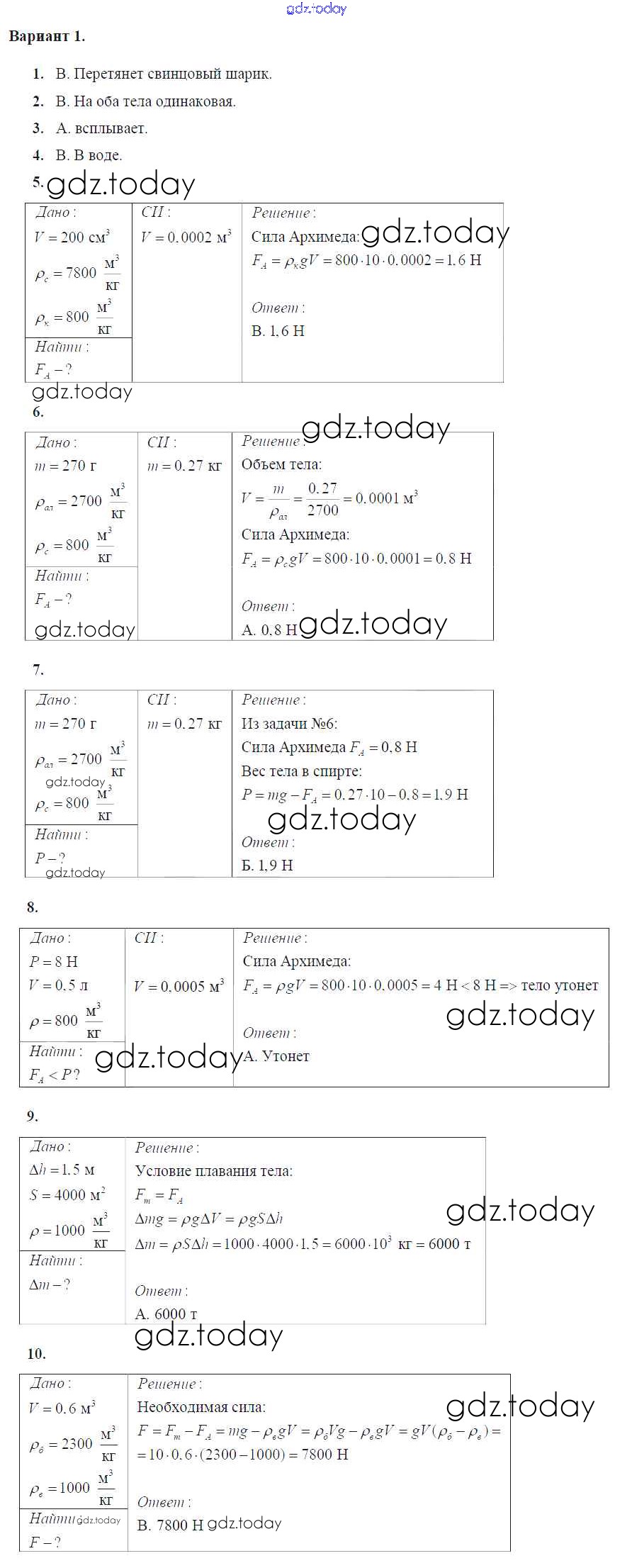 На страницах сайта gdz.today вы найдете учебный и вспомогательный материал, направленный на улучшения знаний школьной программы. ГДЗ - онлайн мир знаний Тест №7. Архимедова сила. Плавание тел Решение к тестам для самоконтроля Вариант №1 Дидактическим материалам по Физике для 7 класса Марон Дрофа Вертикаль 2019