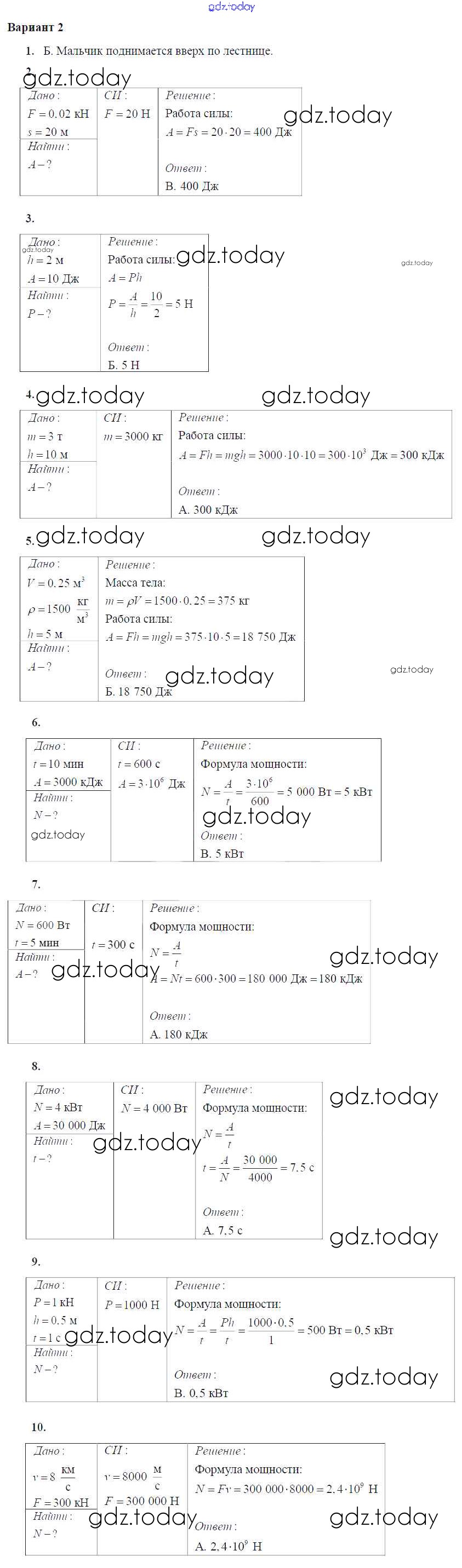 На страницах сайта gdz.today вы найдете учебный и вспомогательный материал, направленный на улучшения знаний школьной программы. ГДЗ - онлайн мир знаний Тест №8. Механическая работа и мощность Решение к тестам для самоконтроля Вариант №2 Дидактическим материалам по Физике для 7 класса Марон Дрофа Вертикаль 2019