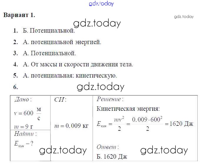 На страницах сайта gdz.today вы найдете учебный и вспомогательный материал, направленный на улучшения знаний школьной программы. ГДЗ - онлайн мир знаний Тест №9. Энергия Решение к тестам для самоконтроля Вариант №1 Дидактическим материалам по Физике для 7 класса Марон Дрофа Вертикаль 2019