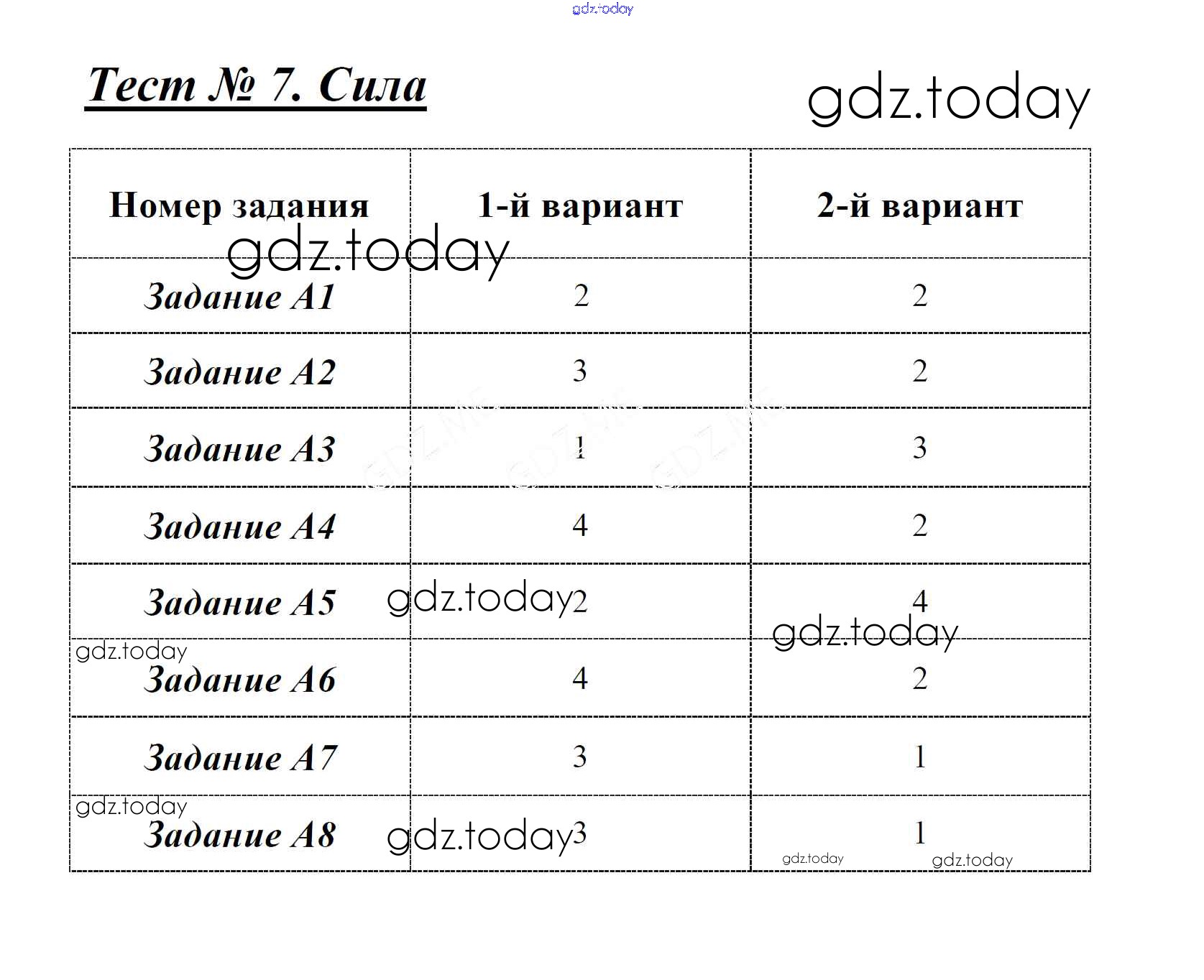 На страницах сайта gdz.today вы найдете учебный и вспомогательный материал, направленный на улучшения знаний школьной программы. ГДЗ - онлайн мир знаний Решение к тестам Тест 7. Сила Контрольно-измерительным материалам (КИМ) по Физике для 7 класса Бобошина Экзамен 2014