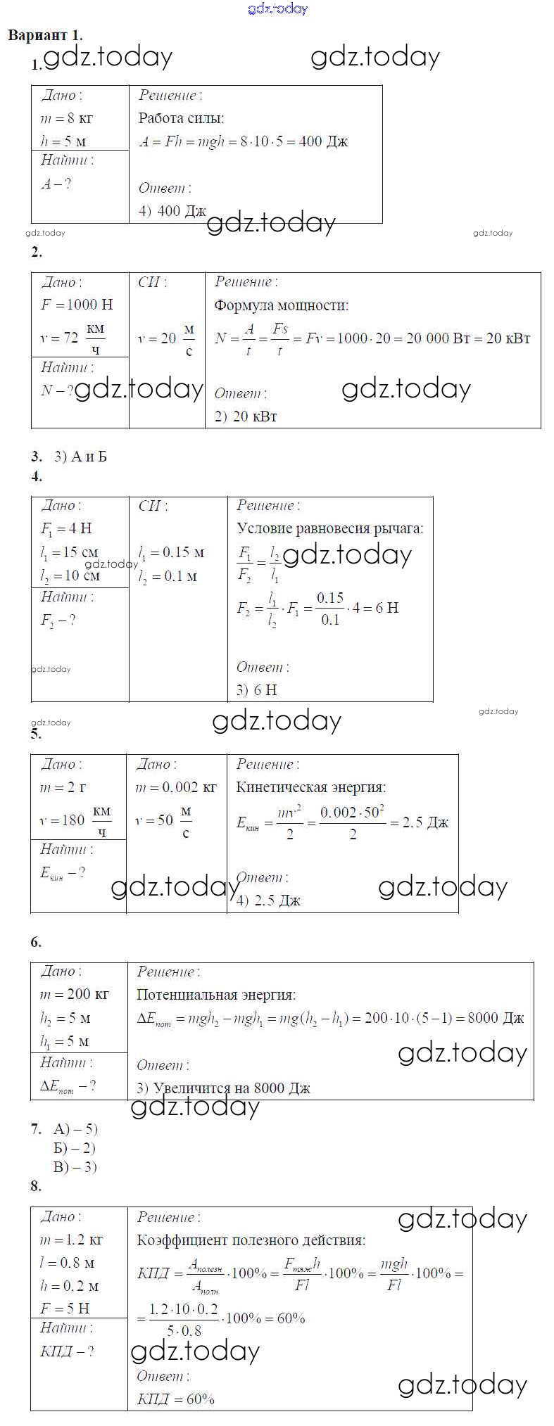 На страницах сайта gdz.today вы найдете учебный и вспомогательный материал, направленный на улучшения знаний школьной программы. ГДЗ - онлайн мир знаний Глава 4. Работа и мощность. Энергия Решение к контрольным работам Вар. 1 Контрольным и самостоятельным работам по Физике для 7 класса Громцева Экзамен УМК 2020