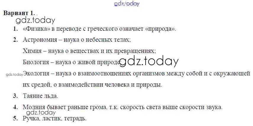 На страницах сайта gdz.today вы найдете учебный и вспомогательный материал, направленный на улучшения знаний школьной программы. ГДЗ - онлайн мир знаний СР №1. Что изучает физика. Некоторые физические термины. Наблюдения и опыты Решение к самостоятельным работам Вар. 1 Контрольным и самостоятельным работам по Физике для 7 класса Громцева Экзамен УМК 2020