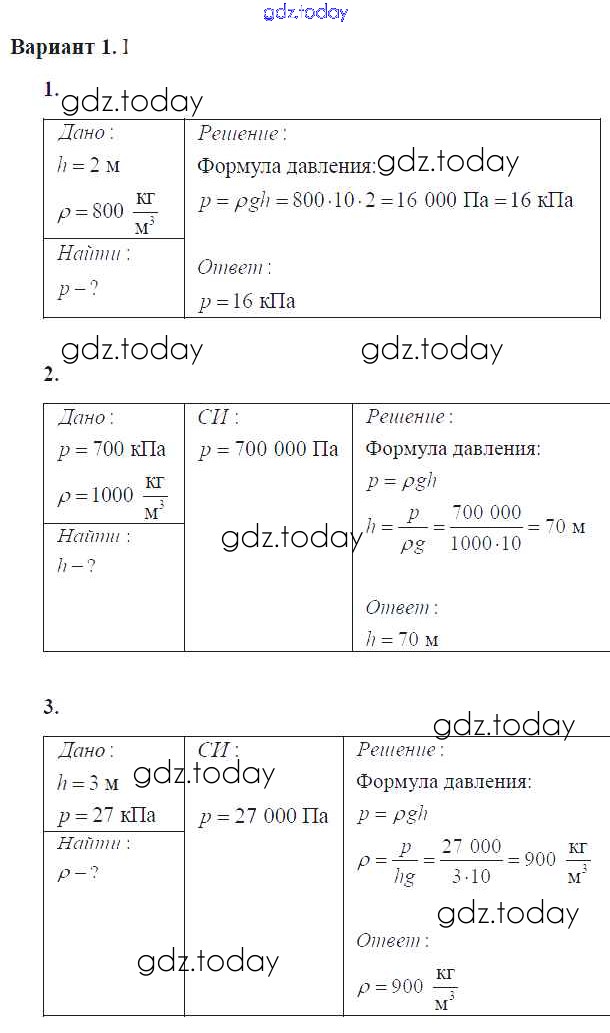 Ответы к СР №29. Расчет давления жидкости на дно и стенки сосуда Решение к самостоятельным работам Вар. 1 Контрольным и самостоятельным работам по Физике для 7 класса Громцева Экзамен УМК 2020