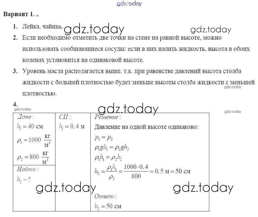 На страницах сайта gdz.today вы найдете учебный и вспомогательный материал, направленный на улучшения знаний школьной программы. ГДЗ - онлайн мир знаний СР №30. Сообщающиеся сосуды Решение к самостоятельным работам Вар. 1 Контрольным и самостоятельным работам по Физике для 7 класса Громцева Экзамен УМК 2020