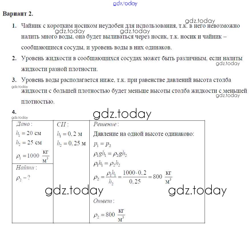 На страницах сайта gdz.today вы найдете учебный и вспомогательный материал, направленный на улучшения знаний школьной программы. ГДЗ - онлайн мир знаний СР №30. Сообщающиеся сосуды Решение к самостоятельным работам Вар. 2 Контрольным и самостоятельным работам по Физике для 7 класса Громцева Экзамен УМК 2020