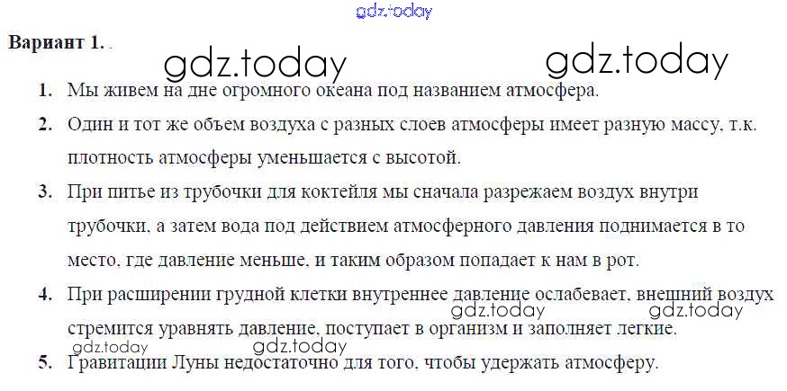 На страницах сайта gdz.today вы найдете учебный и вспомогательный материал, направленный на улучшения знаний школьной программы. ГДЗ - онлайн мир знаний СР №31. Вес воздуха. Атмосферное давление Решение к самостоятельным работам Вар. 1 Контрольным и самостоятельным работам по Физике для 7 класса Громцева Экзамен УМК 2020