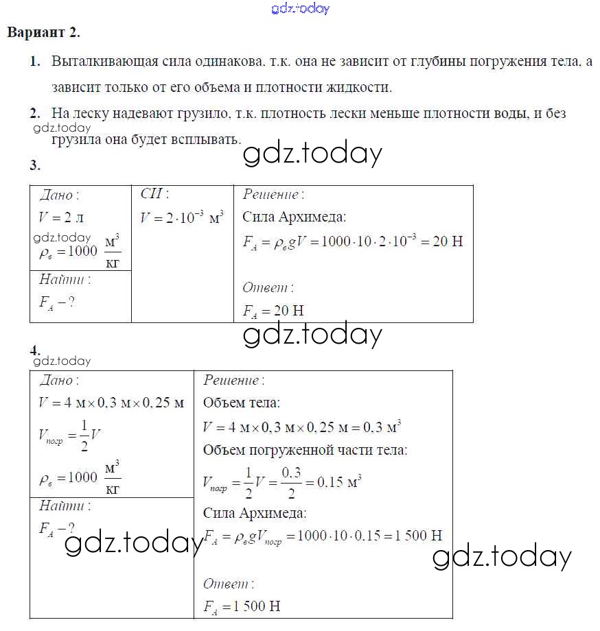 Ответы к СР №37. Архимедова сила Решение к самостоятельным работам Вар. 2 Контрольным и самостоятельным работам по Физике для 7 класса Громцева Экзамен УМК 2020