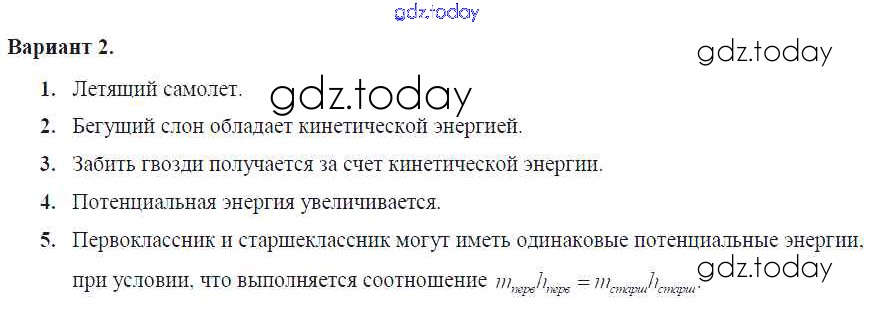 На страницах сайта gdz.today вы найдете учебный и вспомогательный материал, направленный на улучшения знаний школьной программы. ГДЗ - онлайн мир знаний СР №49. Энергия. Потенциальная и кинетическая энергия Решение к самостоятельным работам Вар. 2 Контрольным и самостоятельным работам по Физике для 7 класса Громцева Экзамен УМК 2020