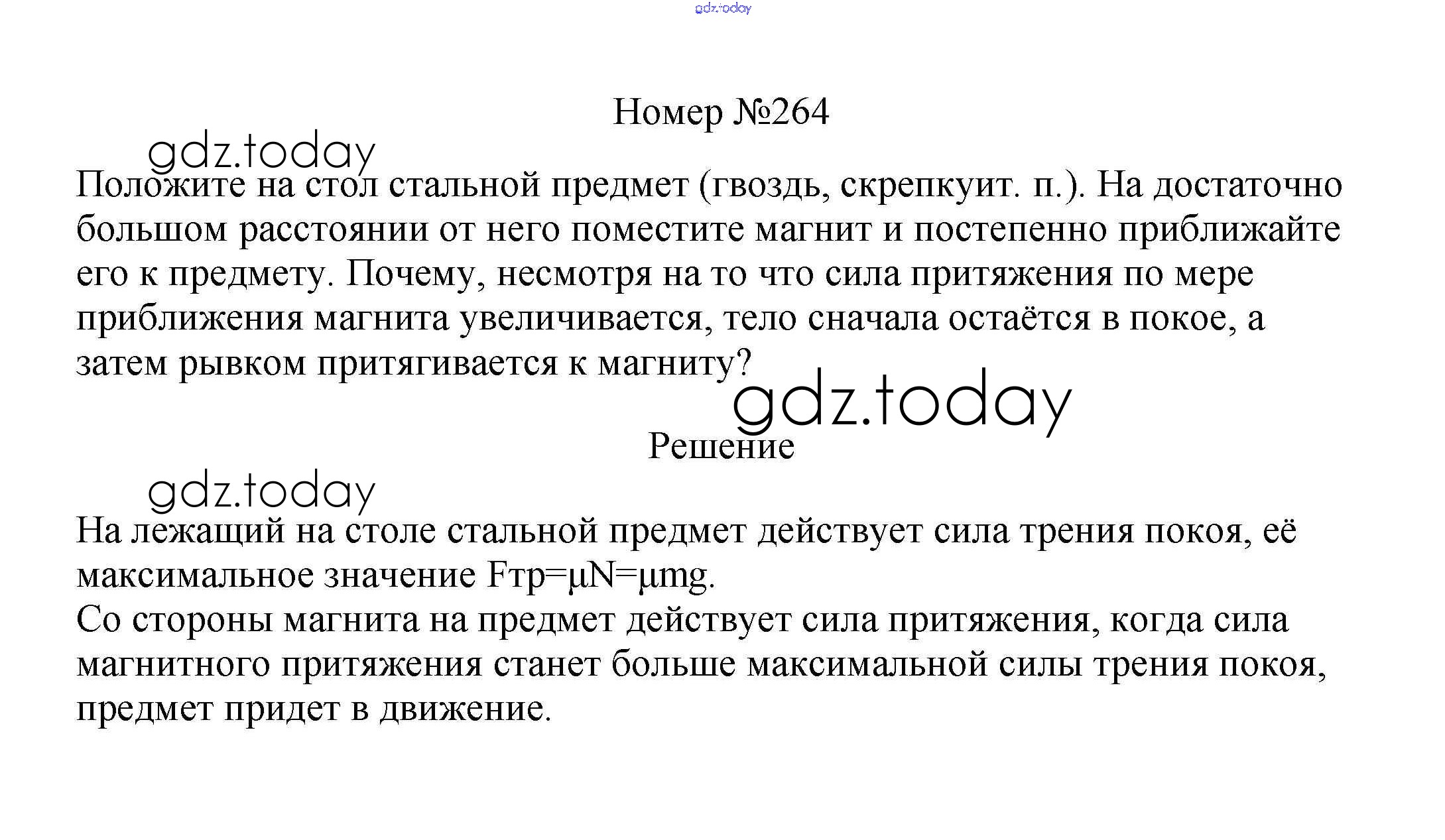 На страницах сайта gdz.today вы найдете учебный и вспомогательный материал, направленный на улучшения знаний школьной программы. ГДЗ - онлайн мир знаний Решение к заданиям 7 класс 264 Сборнику вопросов и задач по Физике для 7-9 класса Марон, Позойский Дрофа Вертикаль 2013