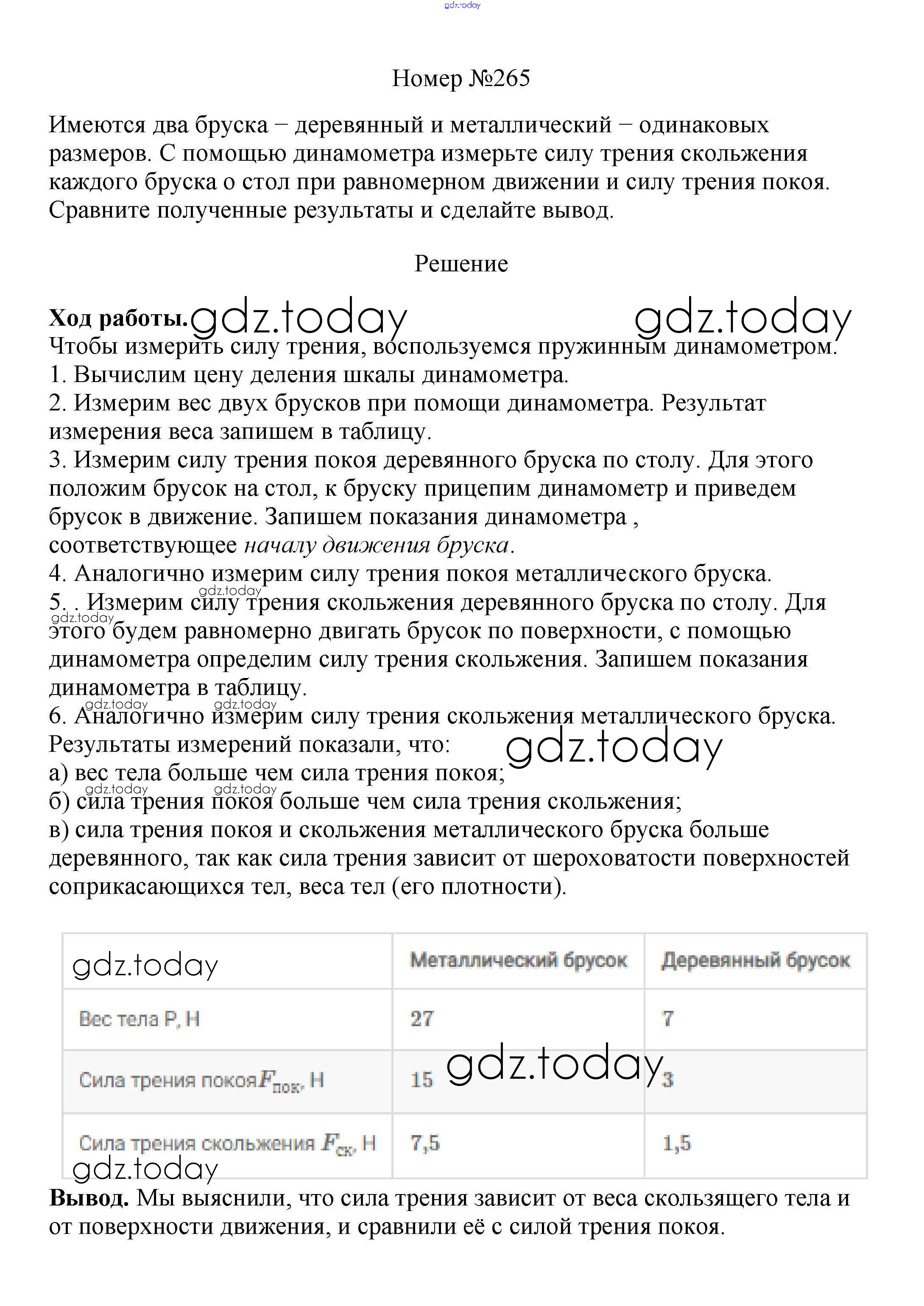 На страницах сайта gdz.today вы найдете учебный и вспомогательный материал, направленный на улучшения знаний школьной программы. ГДЗ - онлайн мир знаний Решение к заданиям 7 класс 265 Сборнику вопросов и задач по Физике для 7-9 класса Марон, Позойский Дрофа Вертикаль 2013