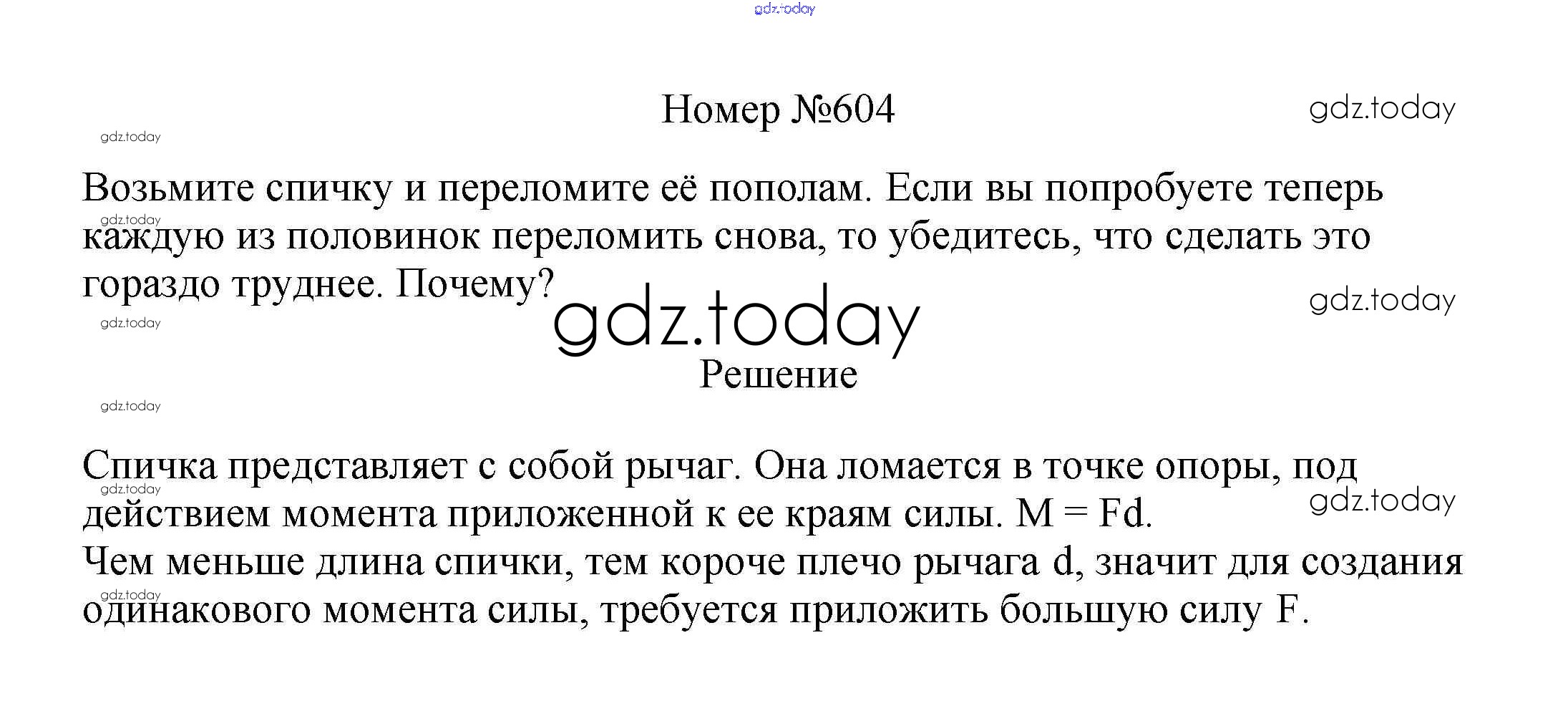 На страницах сайта gdz.today вы найдете учебный и вспомогательный материал, направленный на улучшения знаний школьной программы. ГДЗ - онлайн мир знаний Решение к заданиям 7 класс 604 Сборнику вопросов и задач по Физике для 7-9 класса Марон, Позойский Дрофа Вертикаль 2013