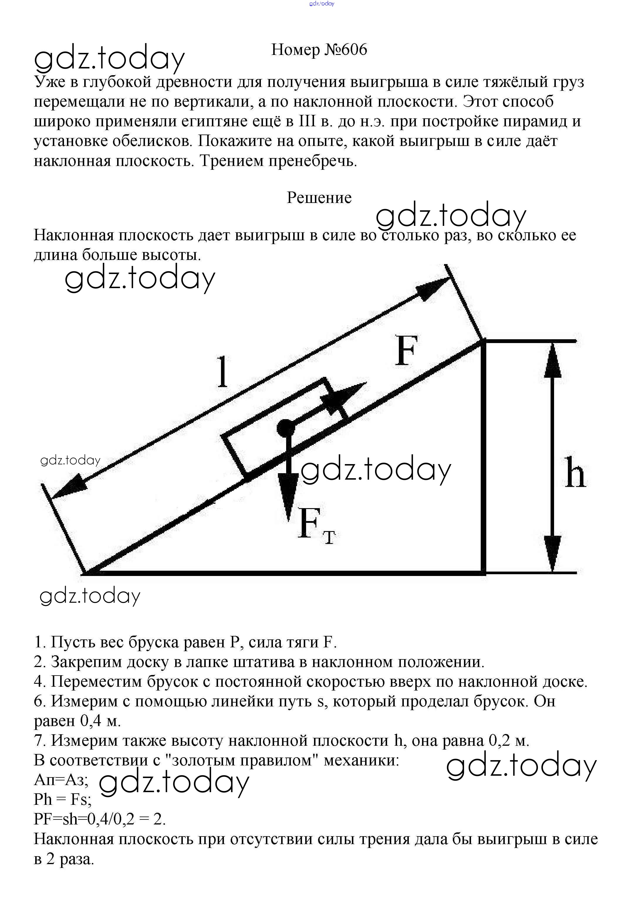 На страницах сайта gdz.today вы найдете учебный и вспомогательный материал, направленный на улучшения знаний школьной программы. ГДЗ - онлайн мир знаний Решение к заданиям 7 класс 606 Сборнику вопросов и задач по Физике для 7-9 класса Марон, Позойский Дрофа Вертикаль 2013
