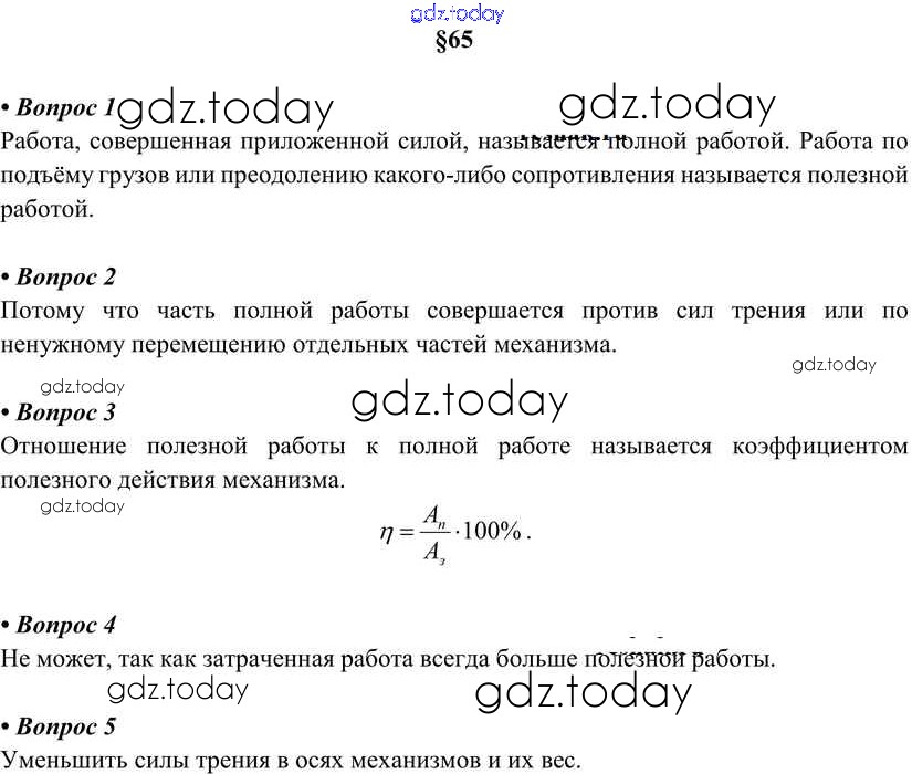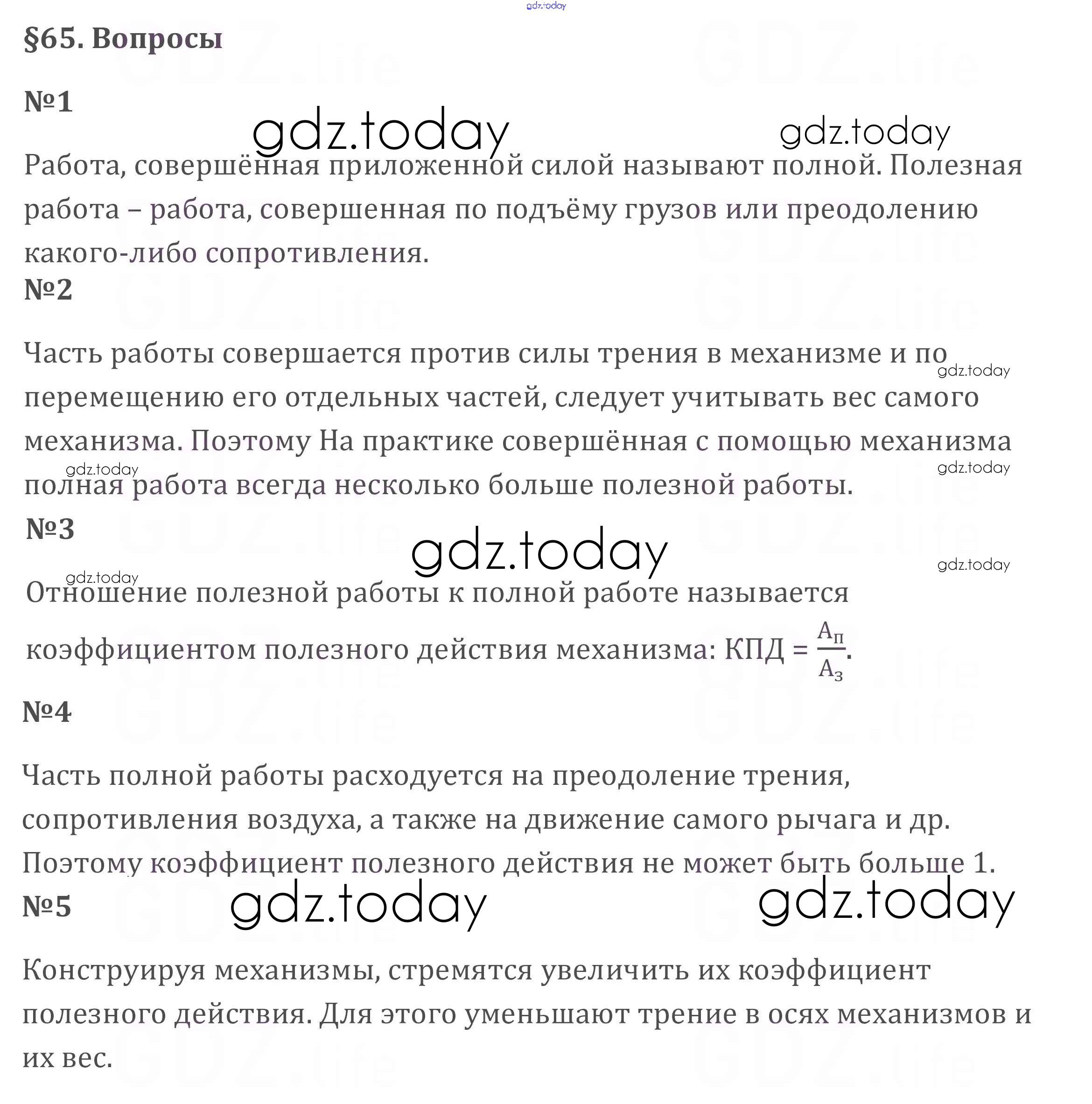Ответы к Вопросы. Параграфы Решение к новому изданию (бело-красный учебник) §65 Учебнику по Физике для 7 класса Перышкин Дрофа Вертикаль 2016