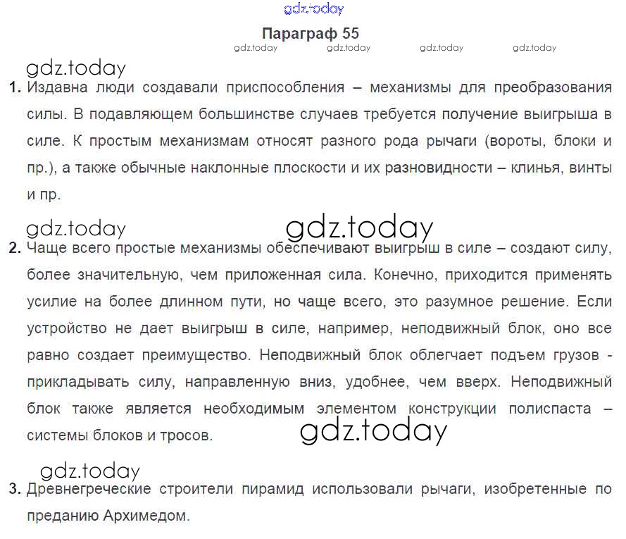 Ответы к Вопросы. Параграфы Решение к старому изданию (синий учебник) §55 Учебнику по Физике для 7 класса Перышкин Дрофа Вертикаль 2016