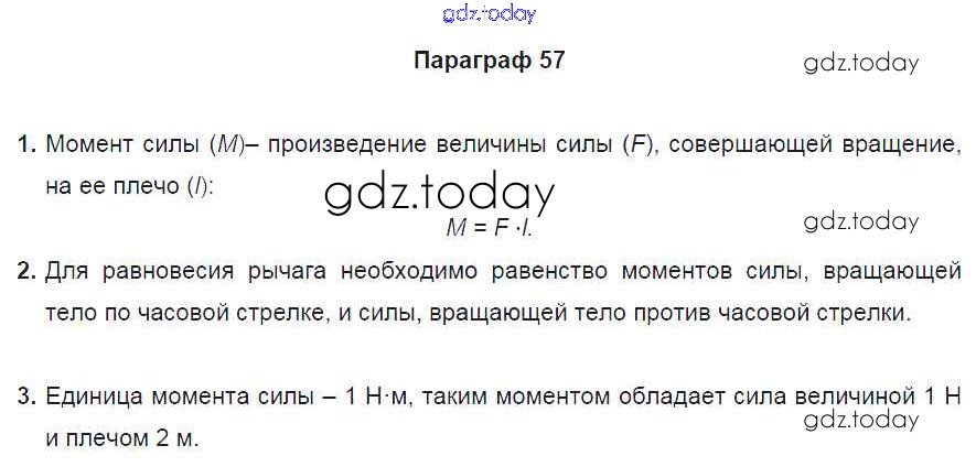 Ответы к Вопросы. Параграфы Решение к старому изданию (синий учебник) §57 Учебнику по Физике для 7 класса Перышкин Дрофа Вертикаль 2016