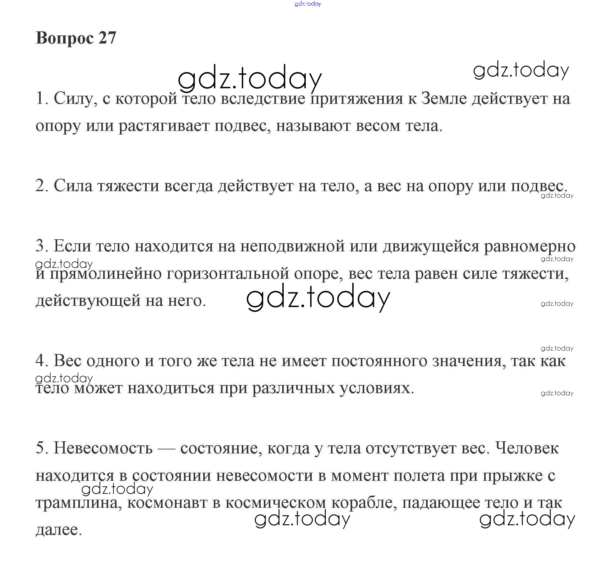На страницах сайта gdz.today вы найдете учебный и вспомогательный материал, направленный на улучшения знаний школьной программы. ГДЗ - онлайн мир знаний Решение к вопросам 27 Учебнику по Физике для 7 класса Пурышева, Важеевская Дрофа 2011