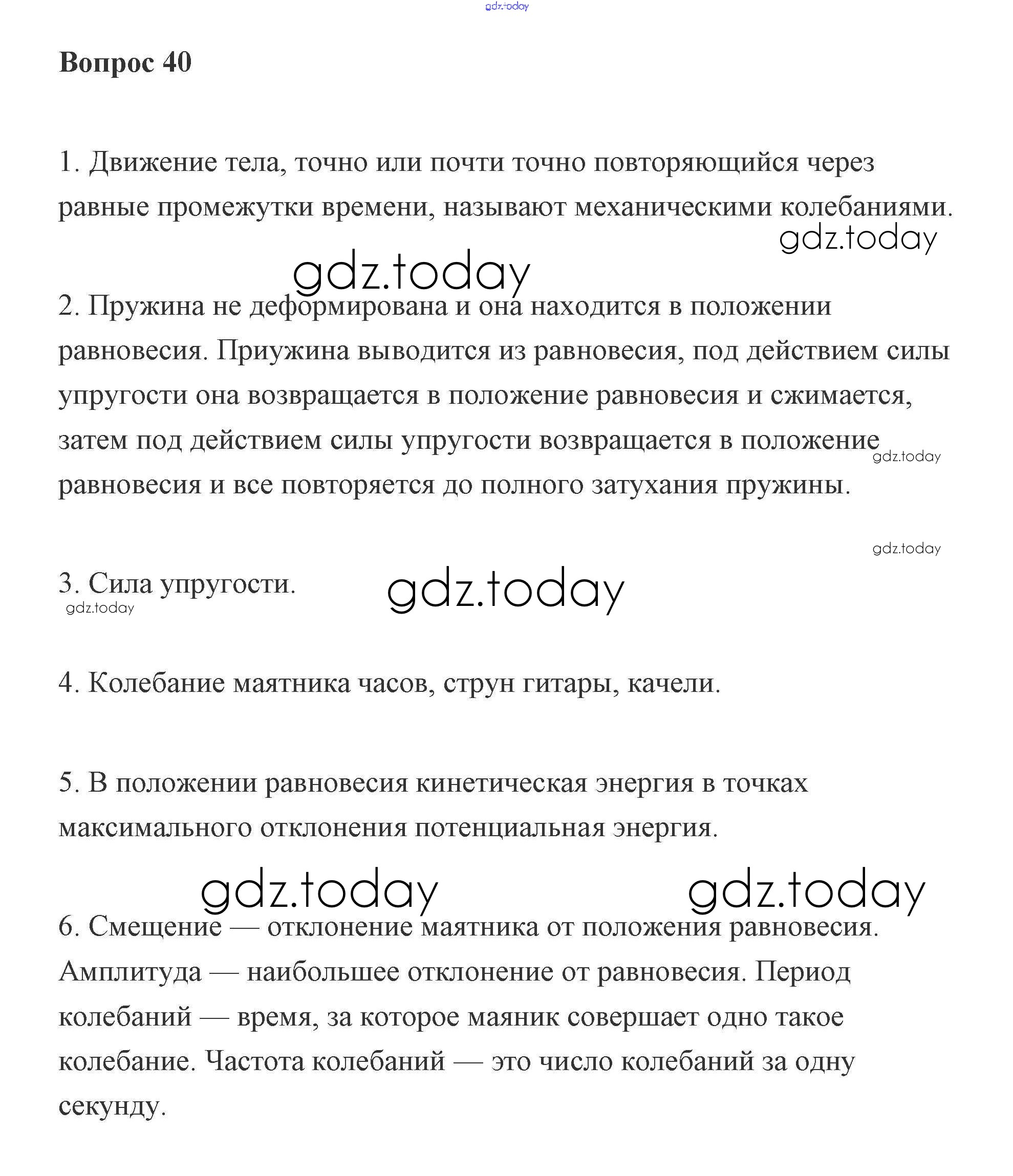 На страницах сайта gdz.today вы найдете учебный и вспомогательный материал, направленный на улучшения знаний школьной программы. ГДЗ - онлайн мир знаний Решение к вопросам 40 Учебнику по Физике для 7 класса Пурышева, Важеевская Дрофа 2011