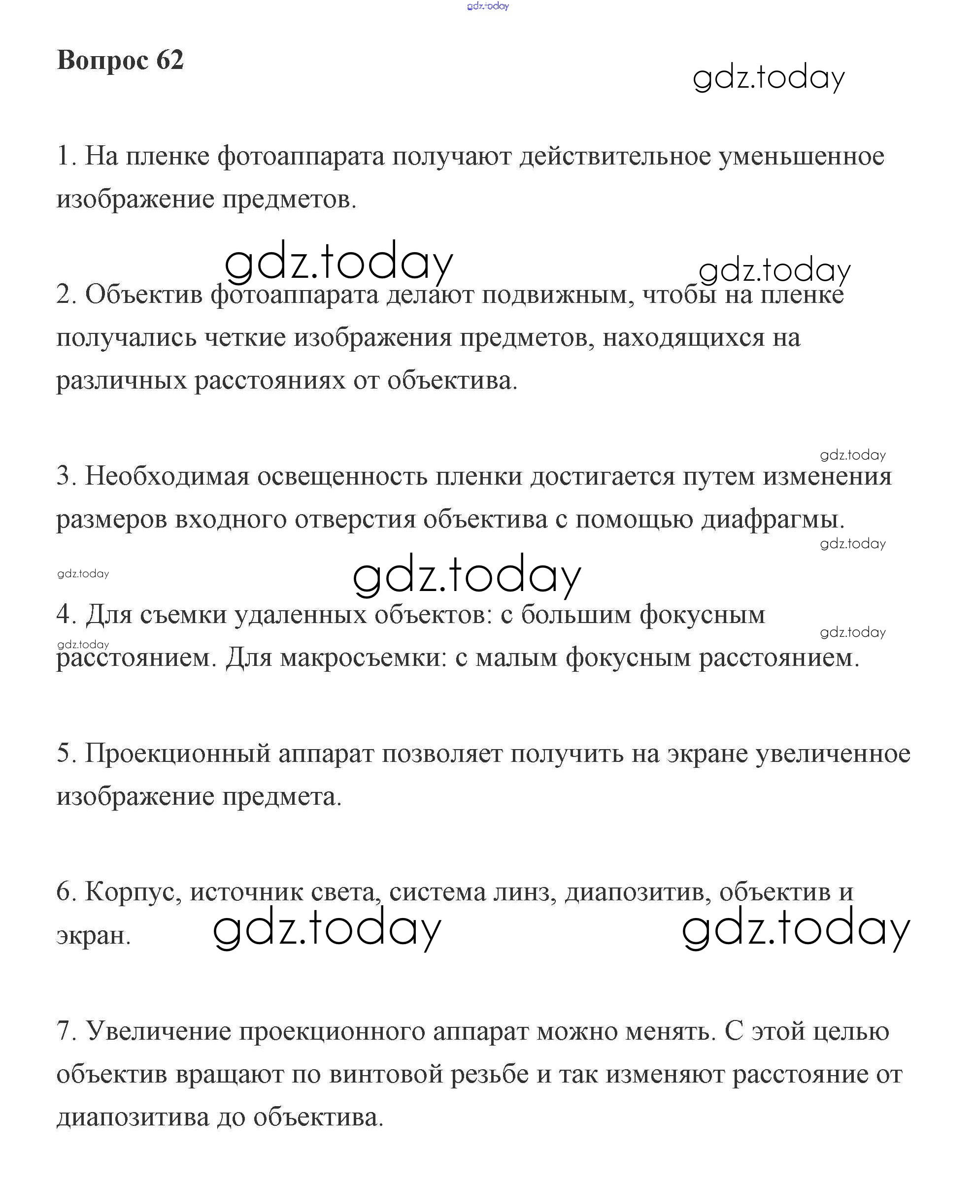 На страницах сайта gdz.today вы найдете учебный и вспомогательный материал, направленный на улучшения знаний школьной программы. ГДЗ - онлайн мир знаний Решение к вопросам 62 Учебнику по Физике для 7 класса Пурышева, Важеевская Дрофа 2011
