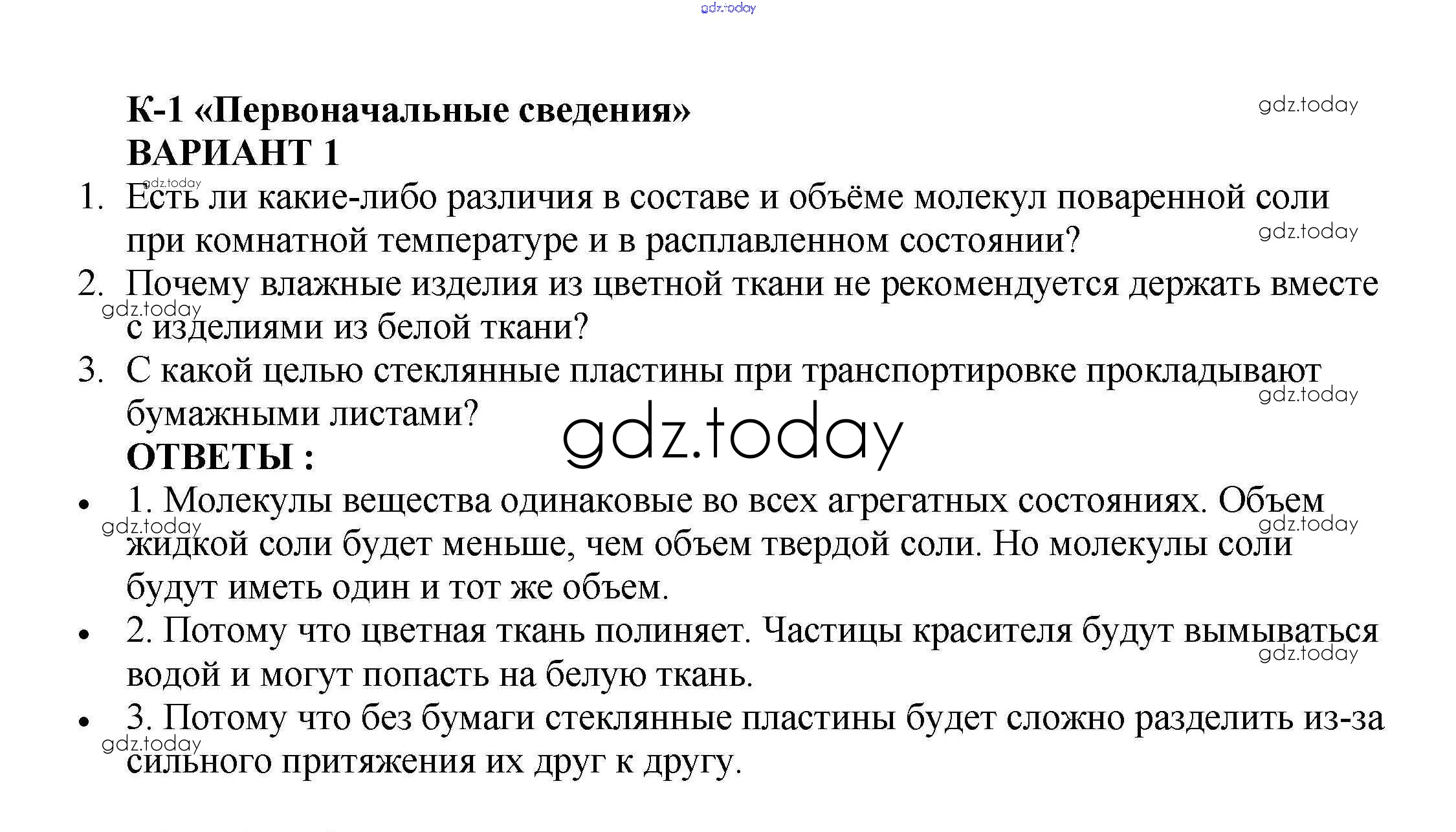 На страницах сайта gdz.today вы найдете учебный и вспомогательный материал, направленный на улучшения знаний школьной программы. ГДЗ - онлайн мир знаний КР №-1. Первоначальные сведения о строении вещества Решение к контрольным работам Вариант №1 Самостоятельным и контрольным работам по Физике для 7 класса Марон Дрофа Вертикаль 2016