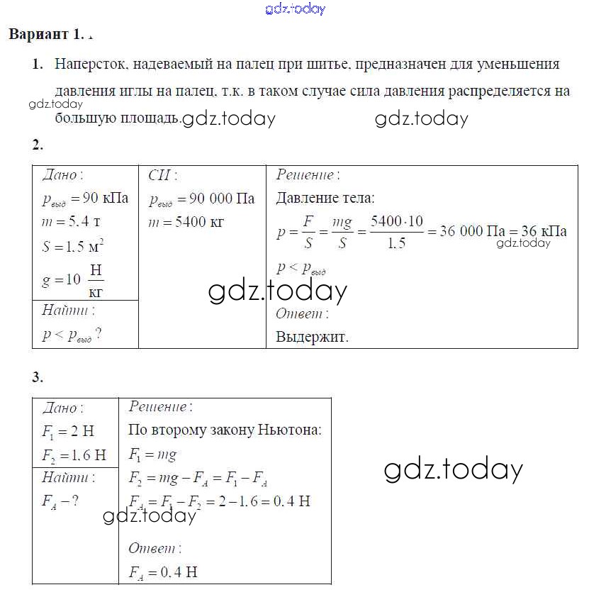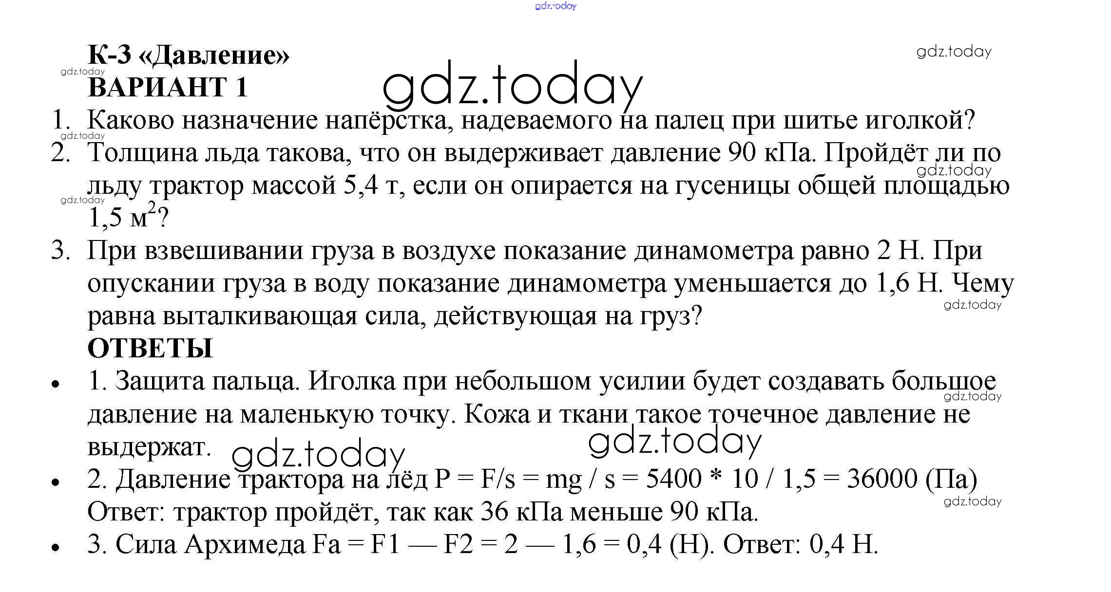 Ответы к КР №-3. Давление твердых тел, жидкостей и газов Решение к контрольным работам Вариант №1 Самостоятельным и контрольным работам по Физике для 7 класса Марон Дрофа Вертикаль 2016
