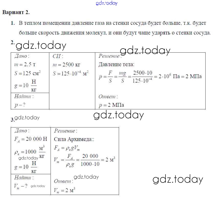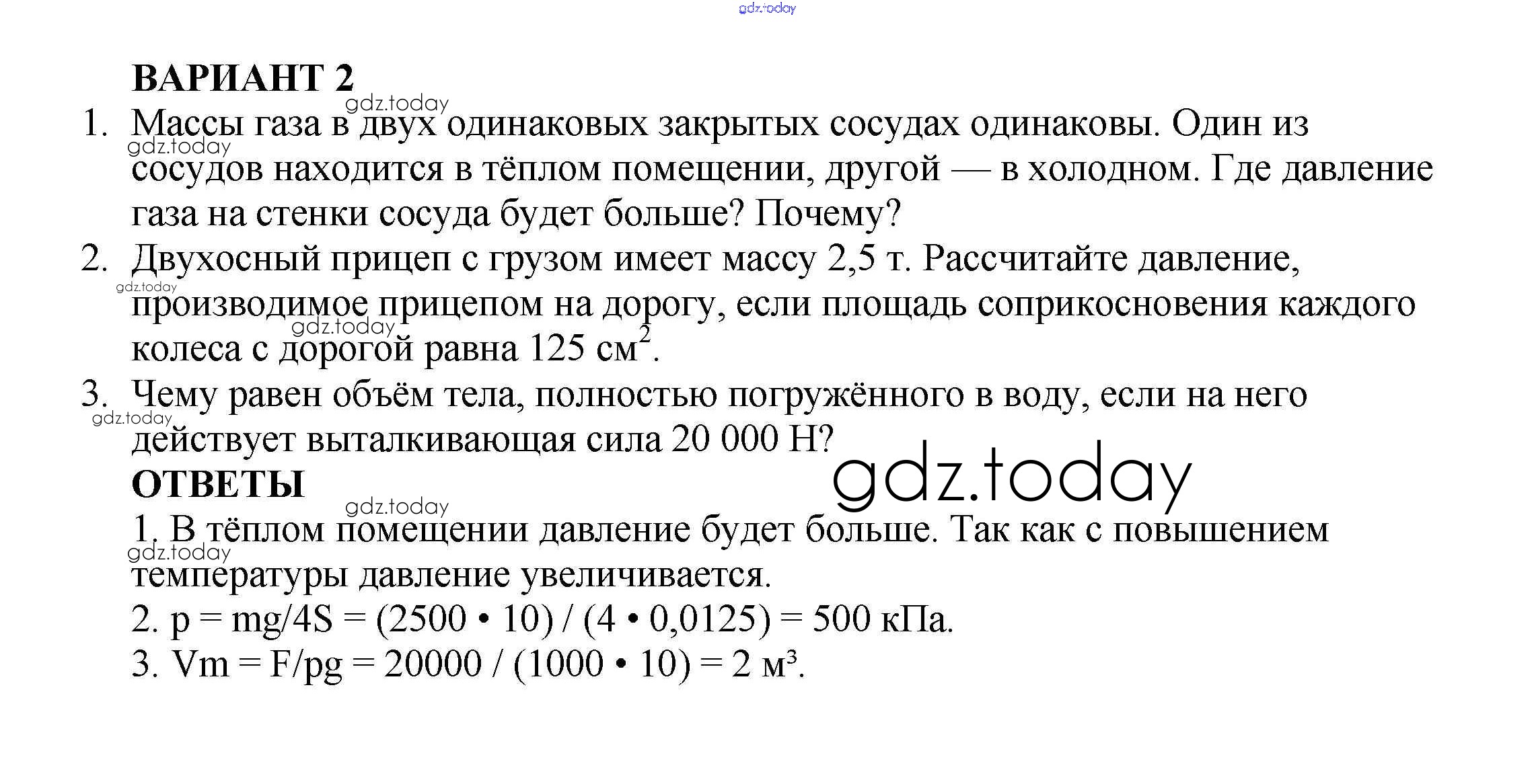 Ответы к КР №-3. Давление твердых тел, жидкостей и газов Решение к контрольным работам Вариант №2 Самостоятельным и контрольным работам по Физике для 7 класса Марон Дрофа Вертикаль 2016
