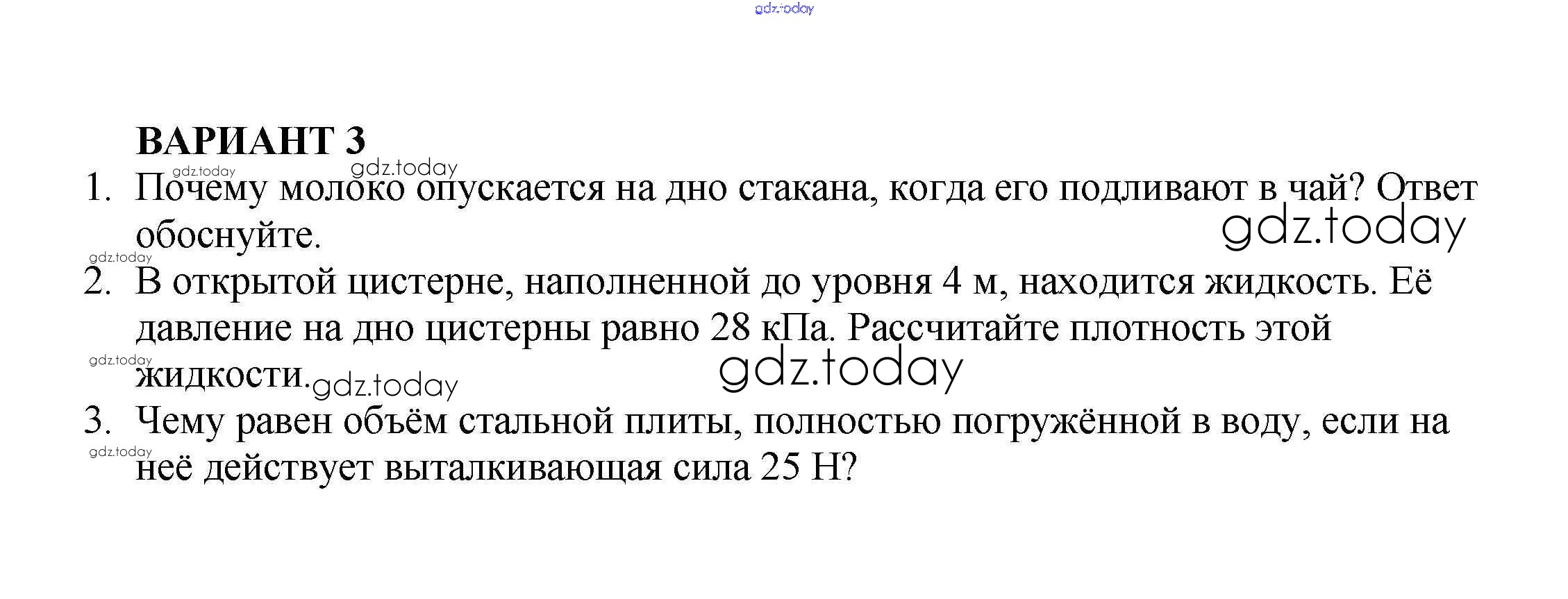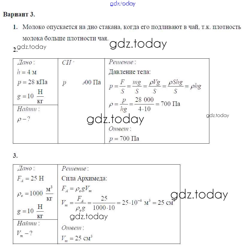 На страницах сайта gdz.today вы найдете учебный и вспомогательный материал, направленный на улучшения знаний школьной программы. ГДЗ - онлайн мир знаний КР №-3. Давление твердых тел, жидкостей и газов Решение к контрольным работам Вариант №3 Самостоятельным и контрольным работам по Физике для 7 класса Марон Дрофа Вертикаль 2016