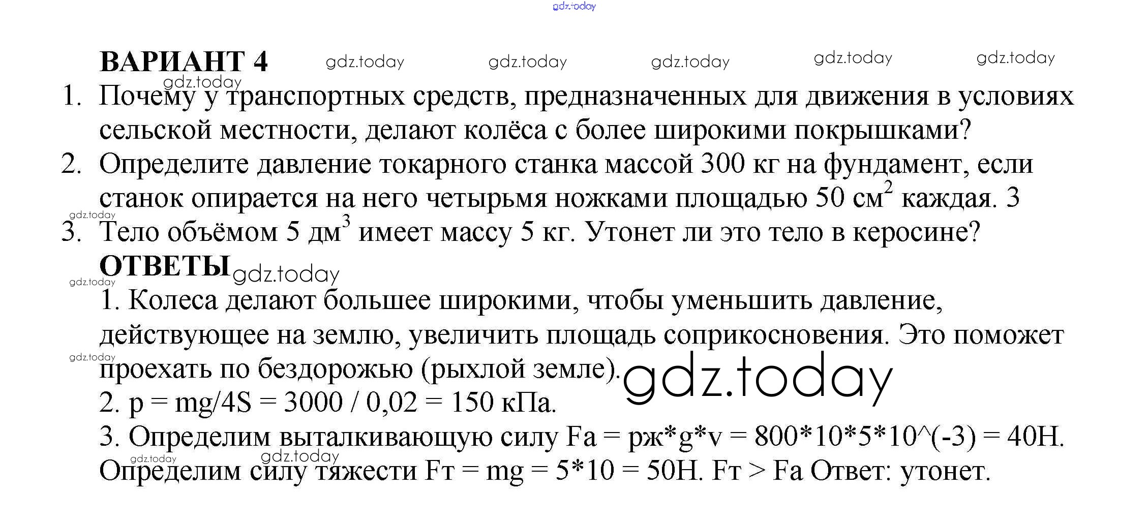 Ответы к КР №-3. Давление твердых тел, жидкостей и газов Решение к контрольным работам Вариант №4 Самостоятельным и контрольным работам по Физике для 7 класса Марон Дрофа Вертикаль 2016