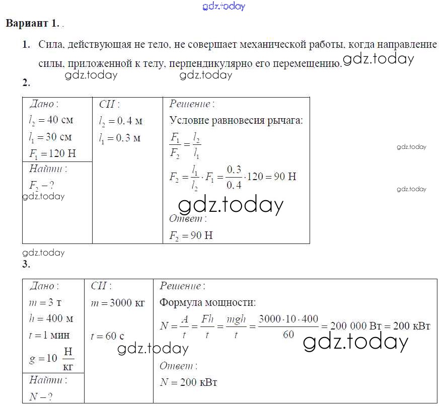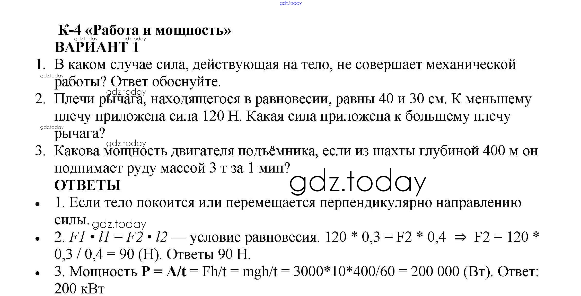 На страницах сайта gdz.today вы найдете учебный и вспомогательный материал, направленный на улучшения знаний школьной программы. ГДЗ - онлайн мир знаний КР №-4. Работа и мощность. Энергия Решение к контрольным работам Вариант №1 Самостоятельным и контрольным работам по Физике для 7 класса Марон Дрофа Вертикаль 2016