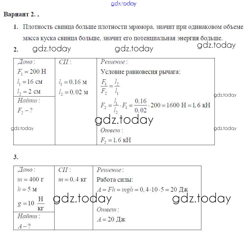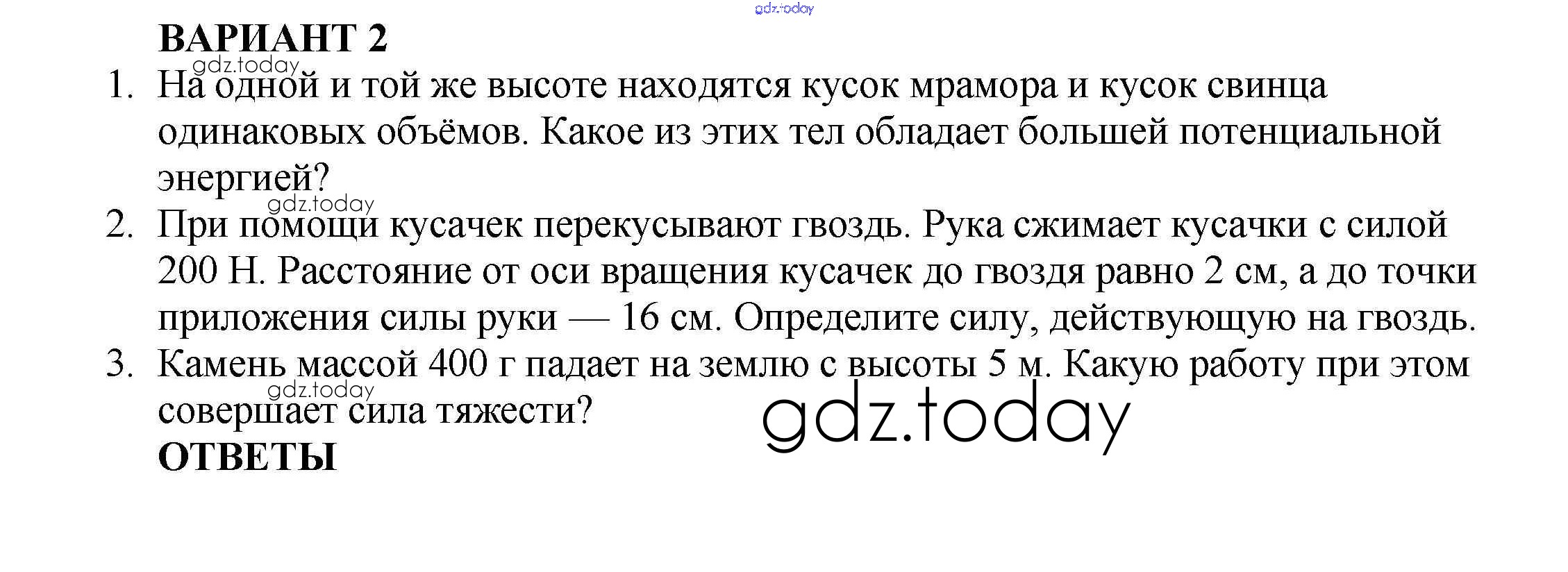 На страницах сайта gdz.today вы найдете учебный и вспомогательный материал, направленный на улучшения знаний школьной программы. ГДЗ - онлайн мир знаний КР №-4. Работа и мощность. Энергия Решение к контрольным работам Вариант №2 Самостоятельным и контрольным работам по Физике для 7 класса Марон Дрофа Вертикаль 2016