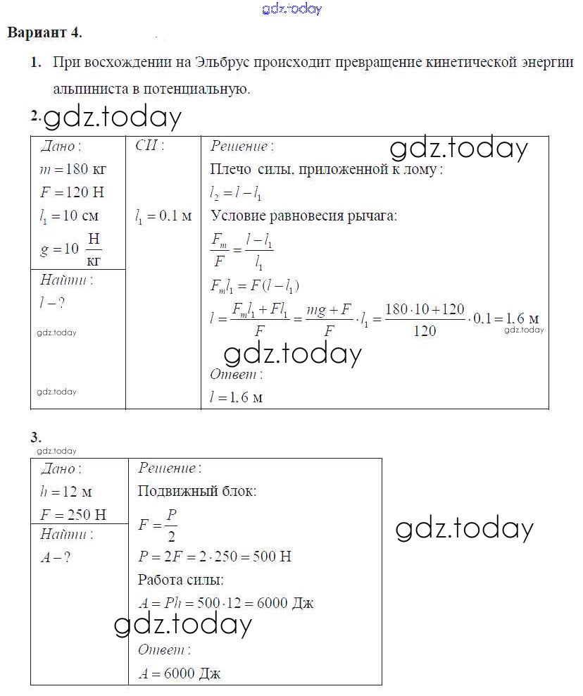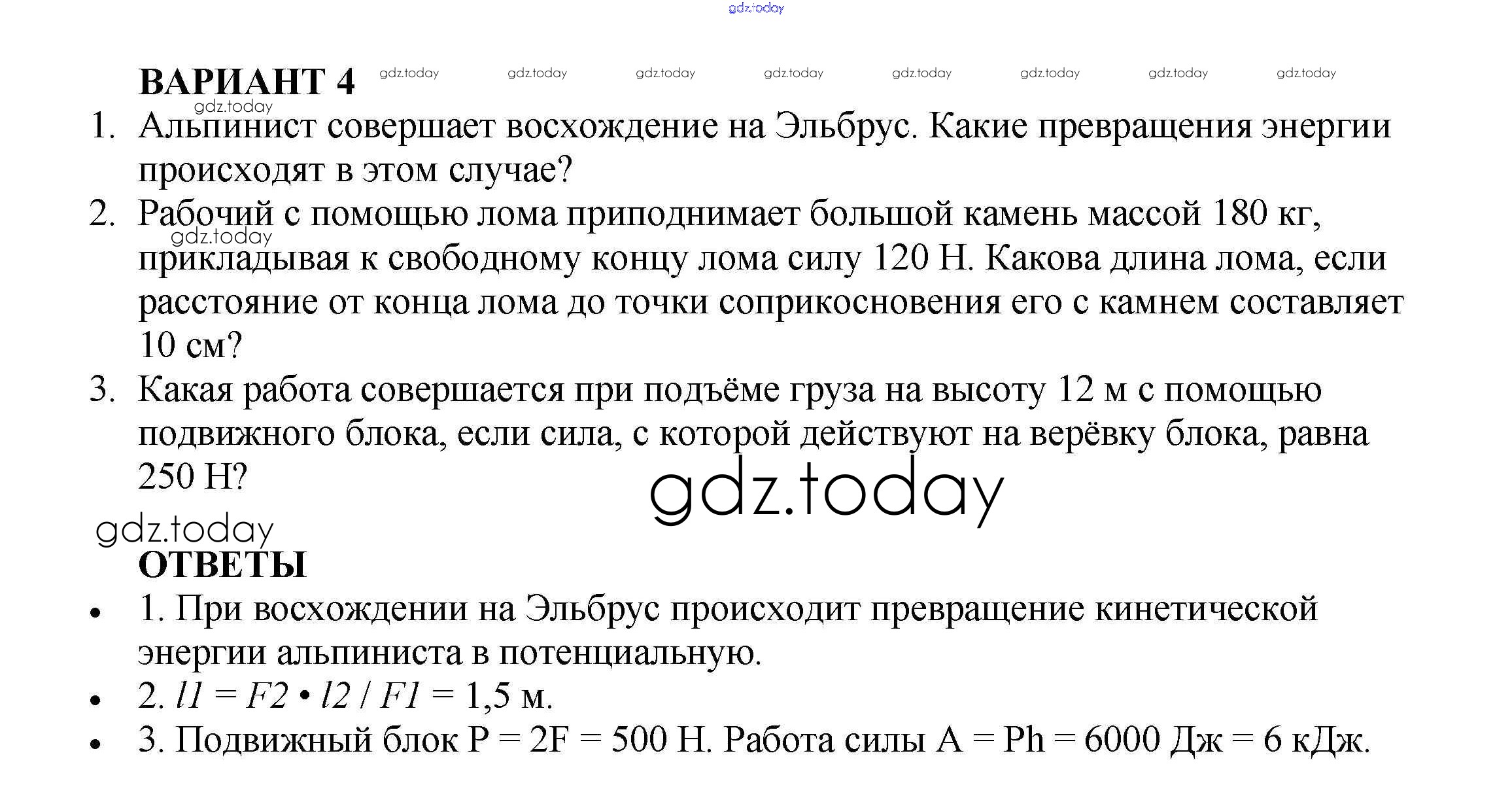 На страницах сайта gdz.today вы найдете учебный и вспомогательный материал, направленный на улучшения знаний школьной программы. ГДЗ - онлайн мир знаний КР №-4. Работа и мощность. Энергия Решение к контрольным работам Вариант №4 Самостоятельным и контрольным работам по Физике для 7 класса Марон Дрофа Вертикаль 2016
