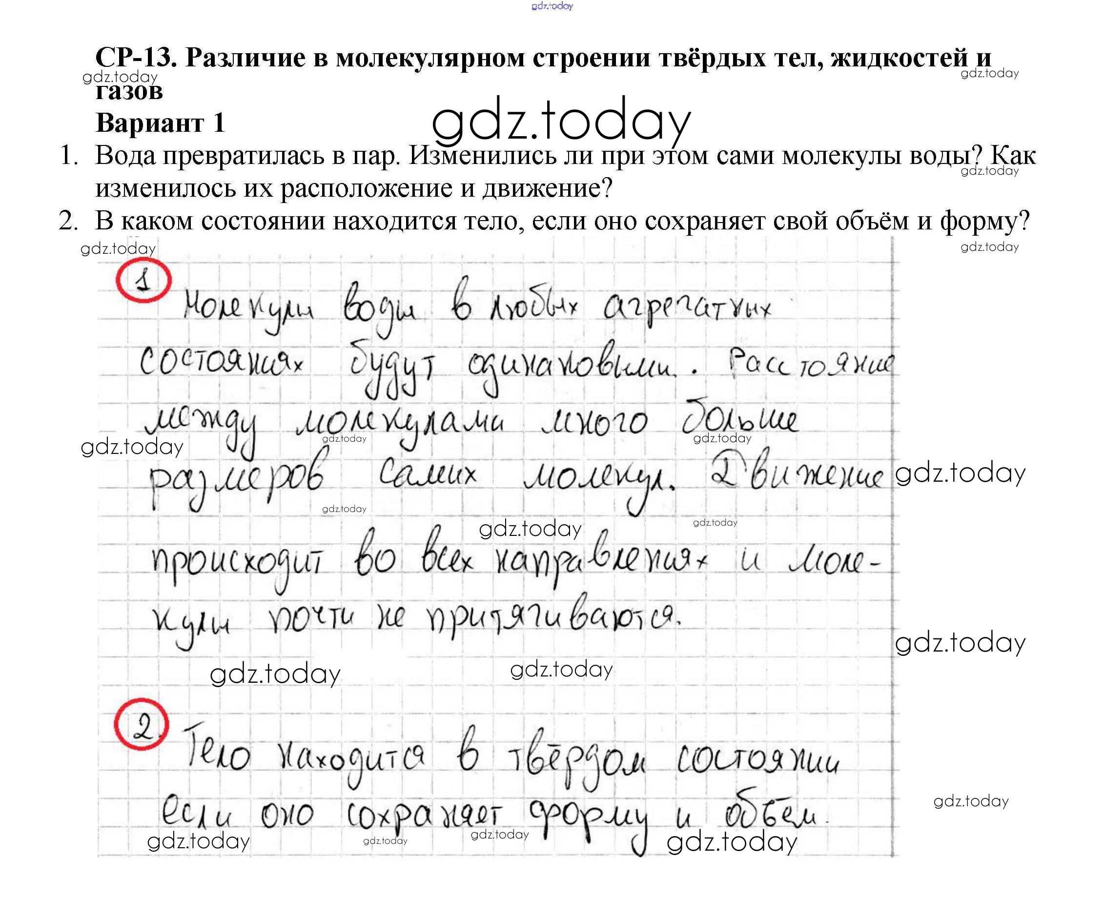 На страницах сайта gdz.today вы найдете учебный и вспомогательный материал, направленный на улучшения знаний школьной программы. ГДЗ - онлайн мир знаний СР-№13. Различия в молекулярном строении твердых тел, жидкостей и газов Решение к самостоятельным работам Вариант №1 Самостоятельным и контрольным работам по Физике для 7 класса Марон Дрофа Вертикаль 2016