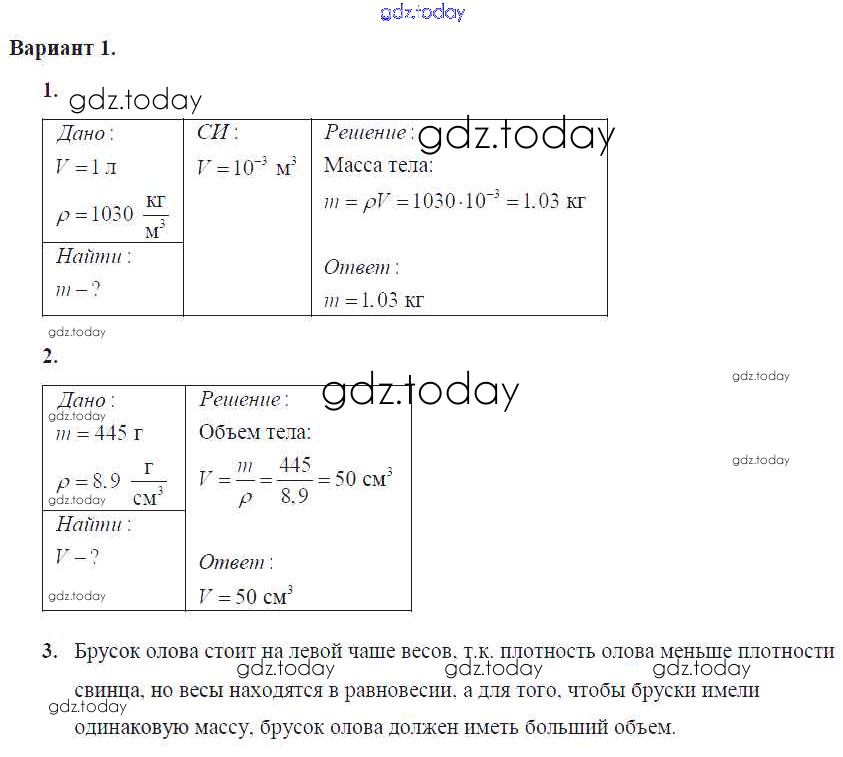 Ответы к СР-№23. Расчет массы и объема тела по его плотности Решение к самостоятельным работам Вариант №1 Самостоятельным и контрольным работам по Физике для 7 класса Марон Дрофа Вертикаль 2016