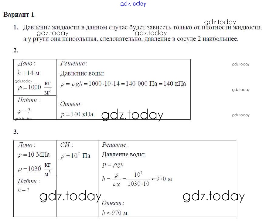 Ответы к СР-№40. Расчет давления жидкости на дно и стенки сосуда Решение к самостоятельным работам Вариант №1 Самостоятельным и контрольным работам по Физике для 7 класса Марон Дрофа Вертикаль 2016