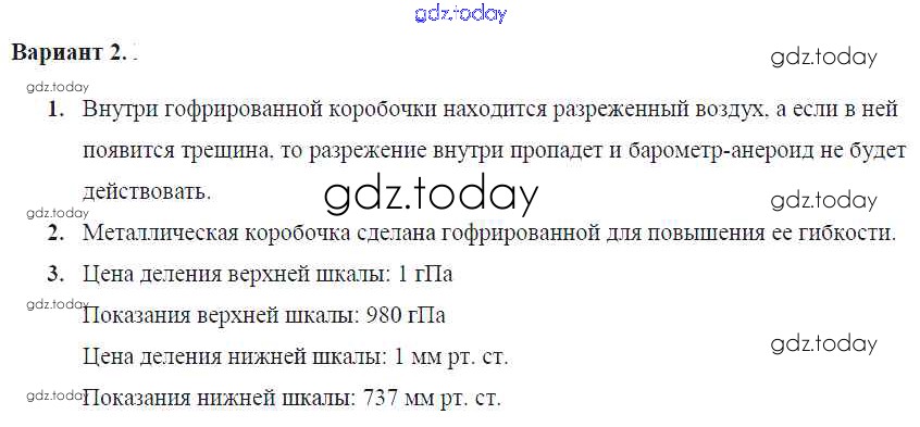 На страницах сайта gdz.today вы найдете учебный и вспомогательный материал, направленный на улучшения знаний школьной программы. ГДЗ - онлайн мир знаний СР-№45. Барометр-анероид Решение к самостоятельным работам Вариант №2 Самостоятельным и контрольным работам по Физике для 7 класса Марон Дрофа Вертикаль 2016