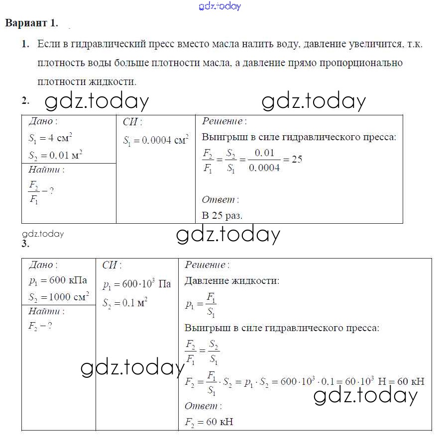 На страницах сайта gdz.today вы найдете учебный и вспомогательный материал, направленный на улучшения знаний школьной программы. ГДЗ - онлайн мир знаний СР-№49. Гидравлический пресс Решение к самостоятельным работам Вариант №1 Самостоятельным и контрольным работам по Физике для 7 класса Марон Дрофа Вертикаль 2016