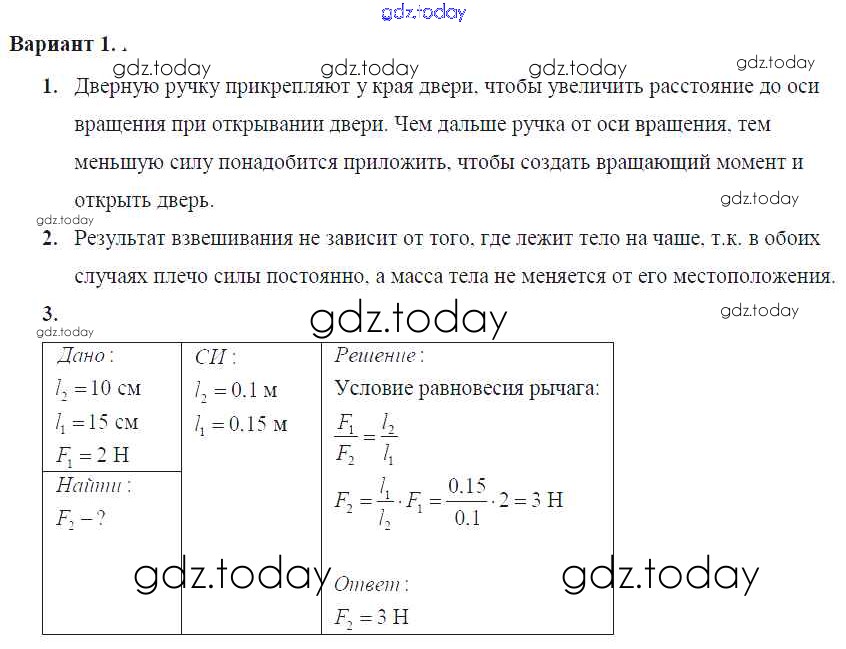 На страницах сайта gdz.today вы найдете учебный и вспомогательный материал, направленный на улучшения знаний школьной программы. ГДЗ - онлайн мир знаний СР-№58. Рычаги. Равновесие сил на рычаге Решение к самостоятельным работам Вариант №1 Самостоятельным и контрольным работам по Физике для 7 класса Марон Дрофа Вертикаль 2016