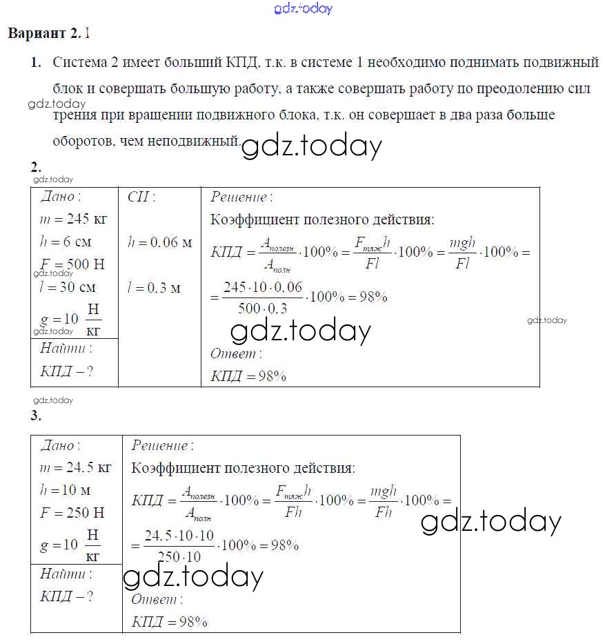 На страницах сайта gdz.today вы найдете учебный и вспомогательный материал, направленный на улучшения знаний школьной программы. ГДЗ - онлайн мир знаний СР-№65. Коэффициент полезного действия механизма Решение к самостоятельным работам Вариант №2 Самостоятельным и контрольным работам по Физике для 7 класса Марон Дрофа Вертикаль 2016