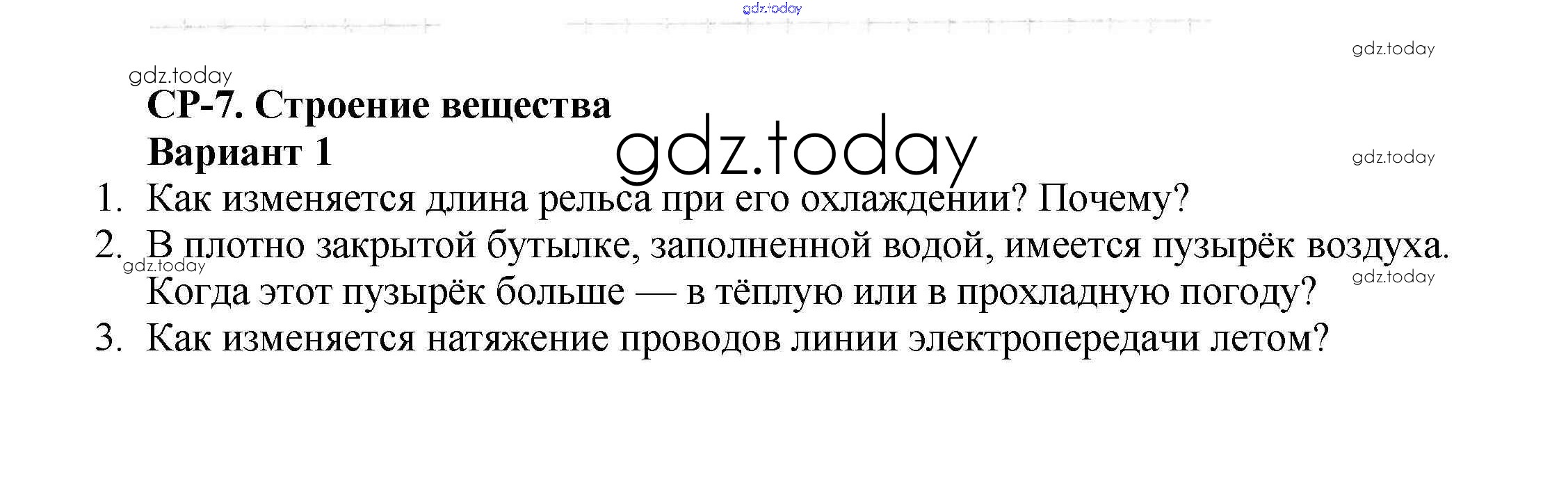 На страницах сайта gdz.today вы найдете учебный и вспомогательный материал, направленный на улучшения знаний школьной программы. ГДЗ - онлайн мир знаний СР-№7. Строение вещества Решение к самостоятельным работам Вариант №1 Самостоятельным и контрольным работам по Физике для 7 класса Марон Дрофа Вертикаль 2016