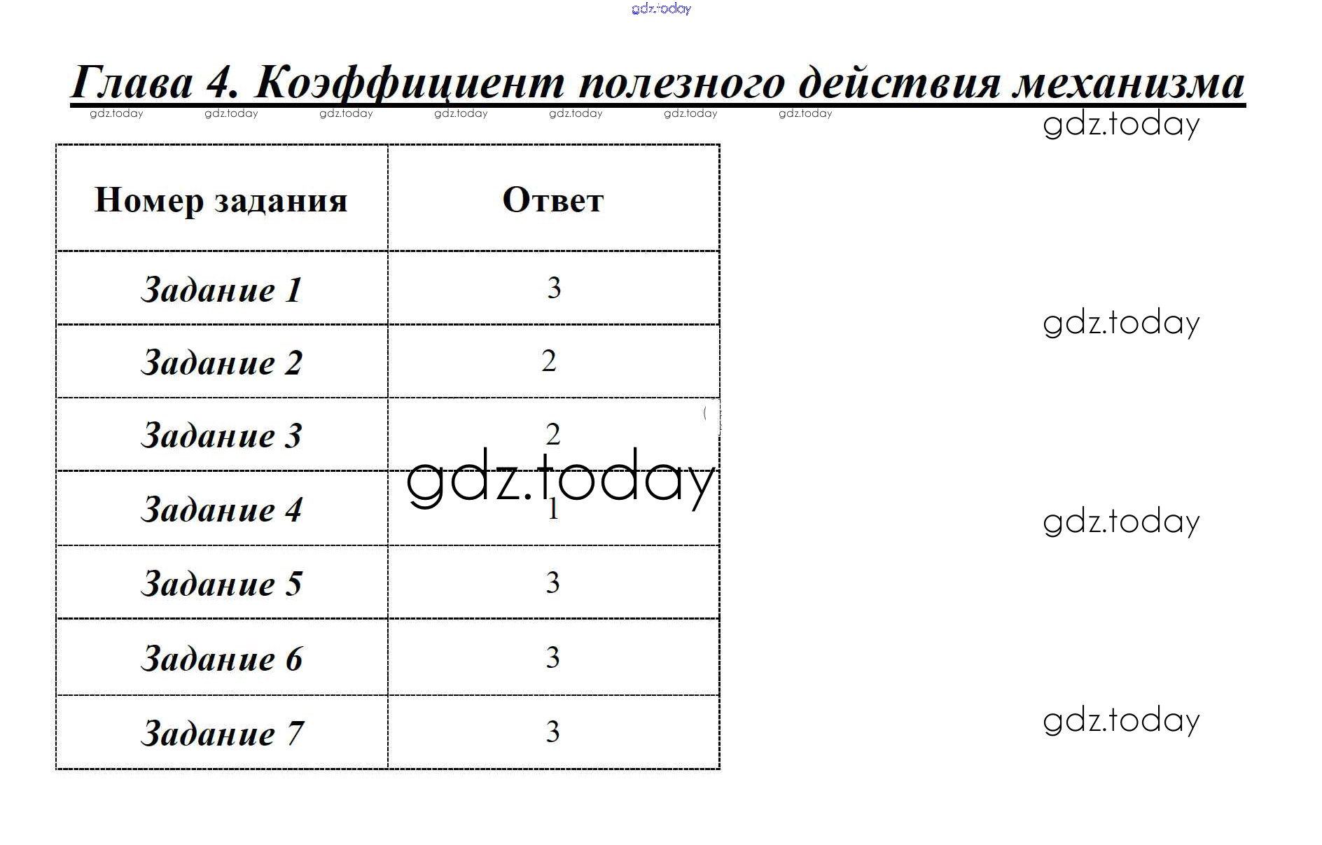 На страницах сайта gdz.today вы найдете учебный и вспомогательный материал, направленный на улучшения знаний школьной программы. ГДЗ - онлайн мир знаний Решение к главе 4 КПД механизма Тестам по Физике для 7 класса Чеботарева Экзамен УМК 2017