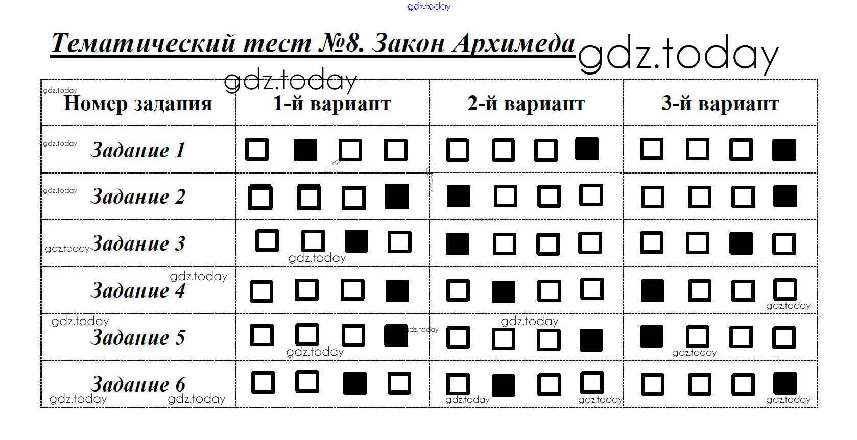 На страницах сайта gdz.today вы найдете учебный и вспомогательный материал, направленный на улучшения знаний школьной программы. ГДЗ - онлайн мир знаний Решение к тестам Тест 8. Закон Архимеда Тестам по Физике для 7 класса Ханнанов, Ханнанова Дрофа Вертикаль 2017