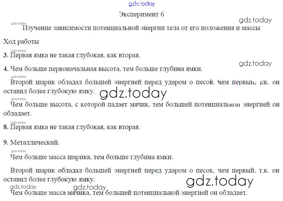 На страницах сайта gdz.today вы найдете учебный и вспомогательный материал, направленный на улучшения знаний школьной программы. ГДЗ - онлайн мир знаний Решение. Эксперименты Эксперимент 6. Изучение зависимости потенциальной энергии тела от его положения и массы Тетради для лабораторных работ по Физике для 7 класса Минькова, Иванова Экзамен УМК 2017