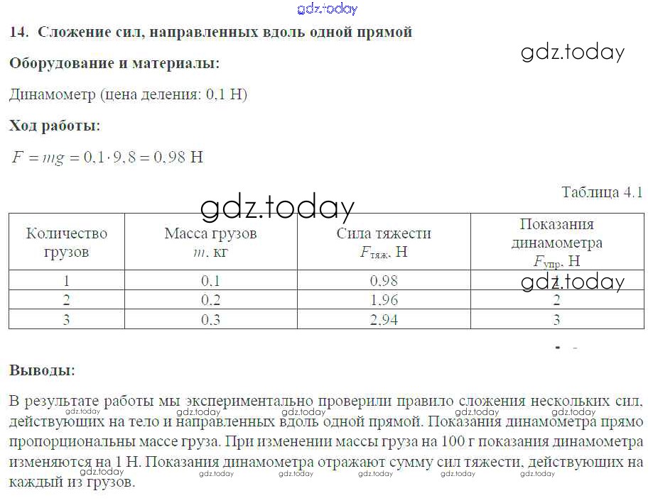 На страницах сайта gdz.today вы найдете учебный и вспомогательный материал, направленный на улучшения знаний школьной программы. ГДЗ - онлайн мир знаний Решение к лабораторным работам №14. Сложение сил, направленных вдоль одной прямой Тетради-практикуму по Физике для 7 класса Белага, Воронцова Просвещение Сферы 2012