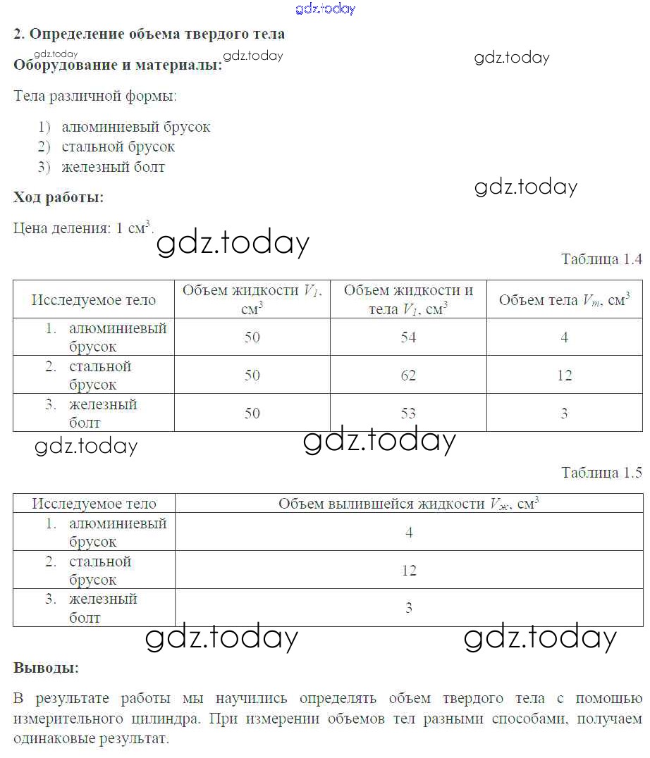 На страницах сайта gdz.today вы найдете учебный и вспомогательный материал, направленный на улучшения знаний школьной программы. ГДЗ - онлайн мир знаний Решение к лабораторным работам №2. Определение объема твердого тела Тетради-практикуму по Физике для 7 класса Белага, Воронцова Просвещение Сферы 2012