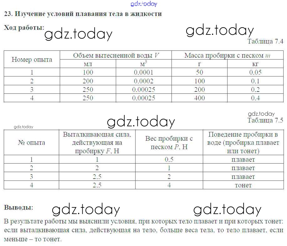 На страницах сайта gdz.today вы найдете учебный и вспомогательный материал, направленный на улучшения знаний школьной программы. ГДЗ - онлайн мир знаний Решение к лабораторным работам №23. Изучение условий плавания тела в жидкости Тетради-практикуму по Физике для 7 класса Белага, Воронцова Просвещение Сферы 2012