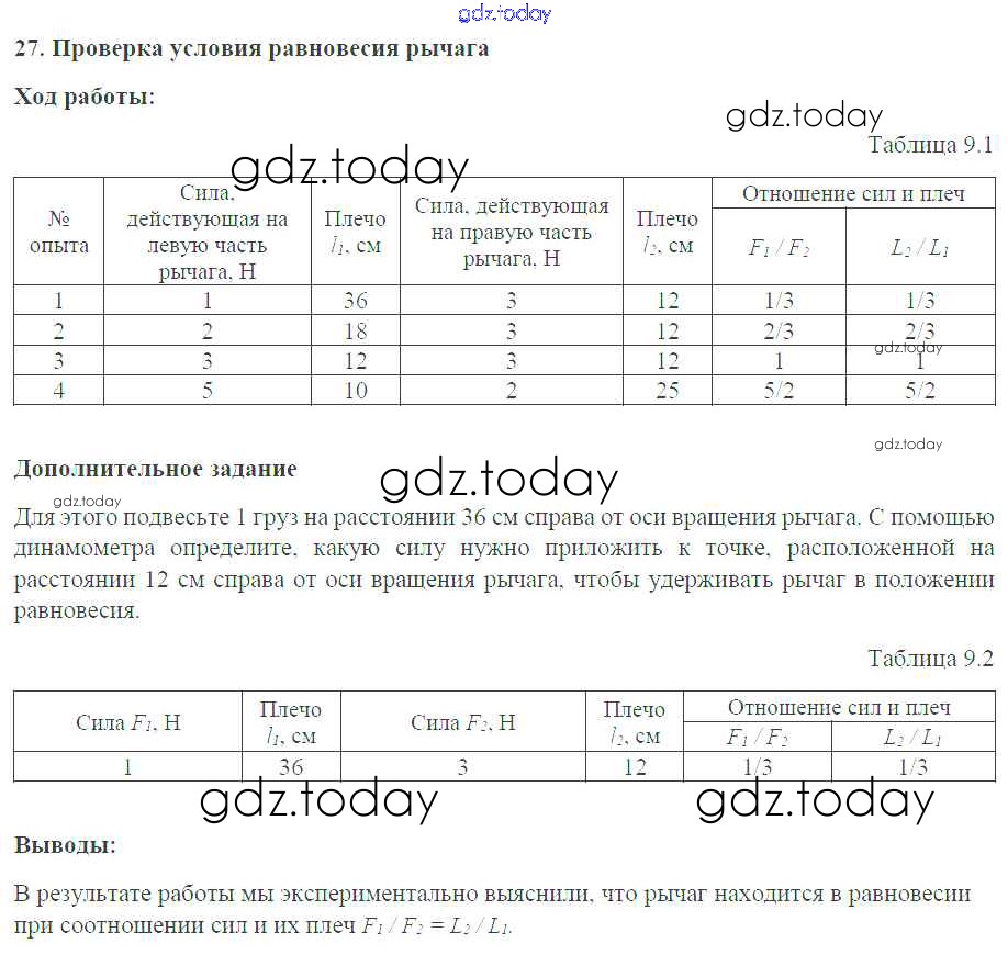 На страницах сайта gdz.today вы найдете учебный и вспомогательный материал, направленный на улучшения знаний школьной программы. ГДЗ - онлайн мир знаний Решение к лабораторным работам №27. Проверка условия равновесия рычага Тетради-практикуму по Физике для 7 класса Белага, Воронцова Просвещение Сферы 2012