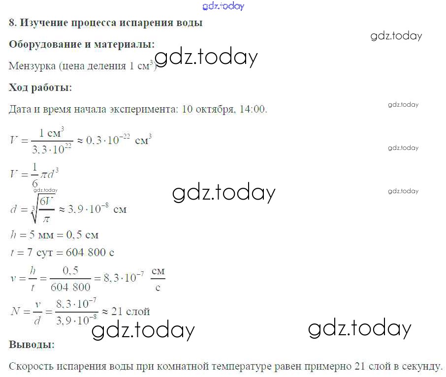 На страницах сайта gdz.today вы найдете учебный и вспомогательный материал, направленный на улучшения знаний школьной программы. ГДЗ - онлайн мир знаний Решение к лабораторным работам №8. Изучение процесса испарения воды Тетради-практикуму по Физике для 7 класса Белага, Воронцова Просвещение Сферы 2012